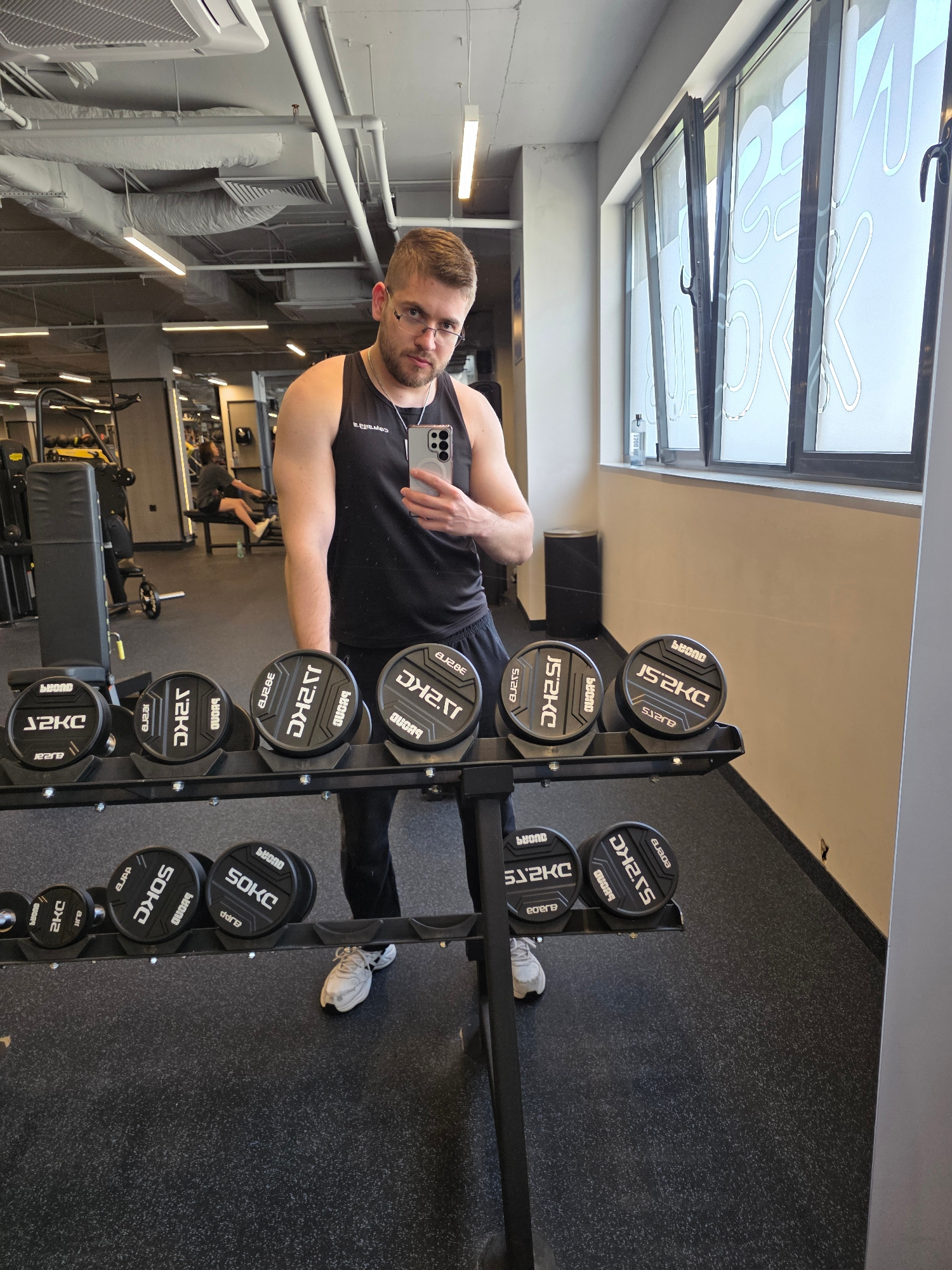 The image displays a selfie taken by a man reflected in a large mirror within a modern gym setting, likely located in Plovdiv, Bulgaria. The man, seen from the chest up, is wearing a black sleeveless…read more