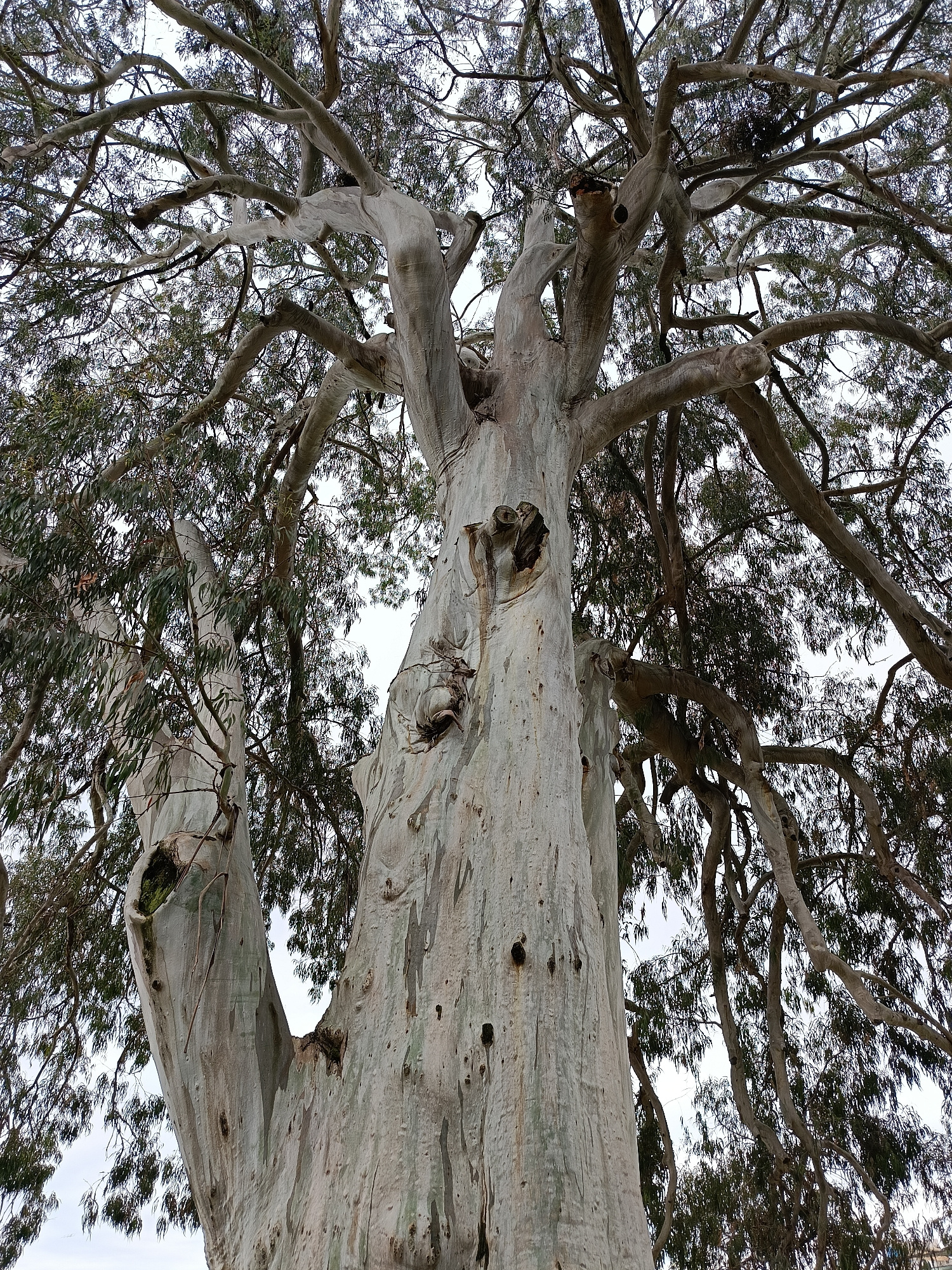 The image shows a large eucalyptus tree, identified by its smooth, pale bark and characteristic long, sickle-shaped leaves. The tree trunk is thick and textured, with several hollows and scars visible…read more
