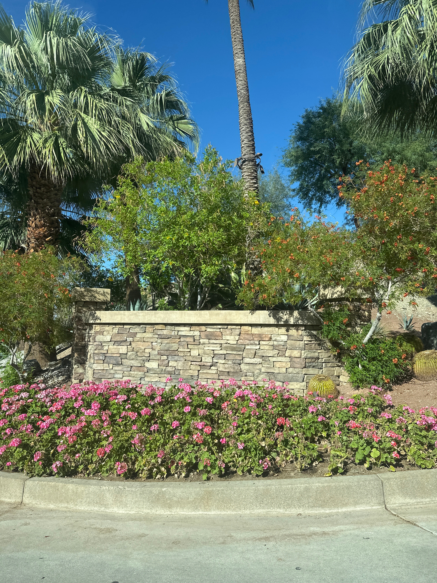 The image depicts a sunny outdoor scene in Rancho Mirage, California. The frame is dominated by desert landscaping featuring a stone wall, a variety of plants including flowering bushes with pink flow…read more
