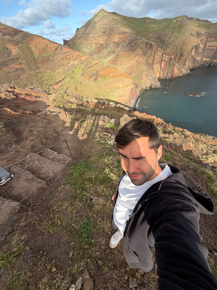 A man takes a selfie near the edge of a cliff overlooking the ocean. He is wearing a white t-shirt and a black hoodie. The cliffs are steep and rugged with visible rock layers and some vegetation. Belโฆread more