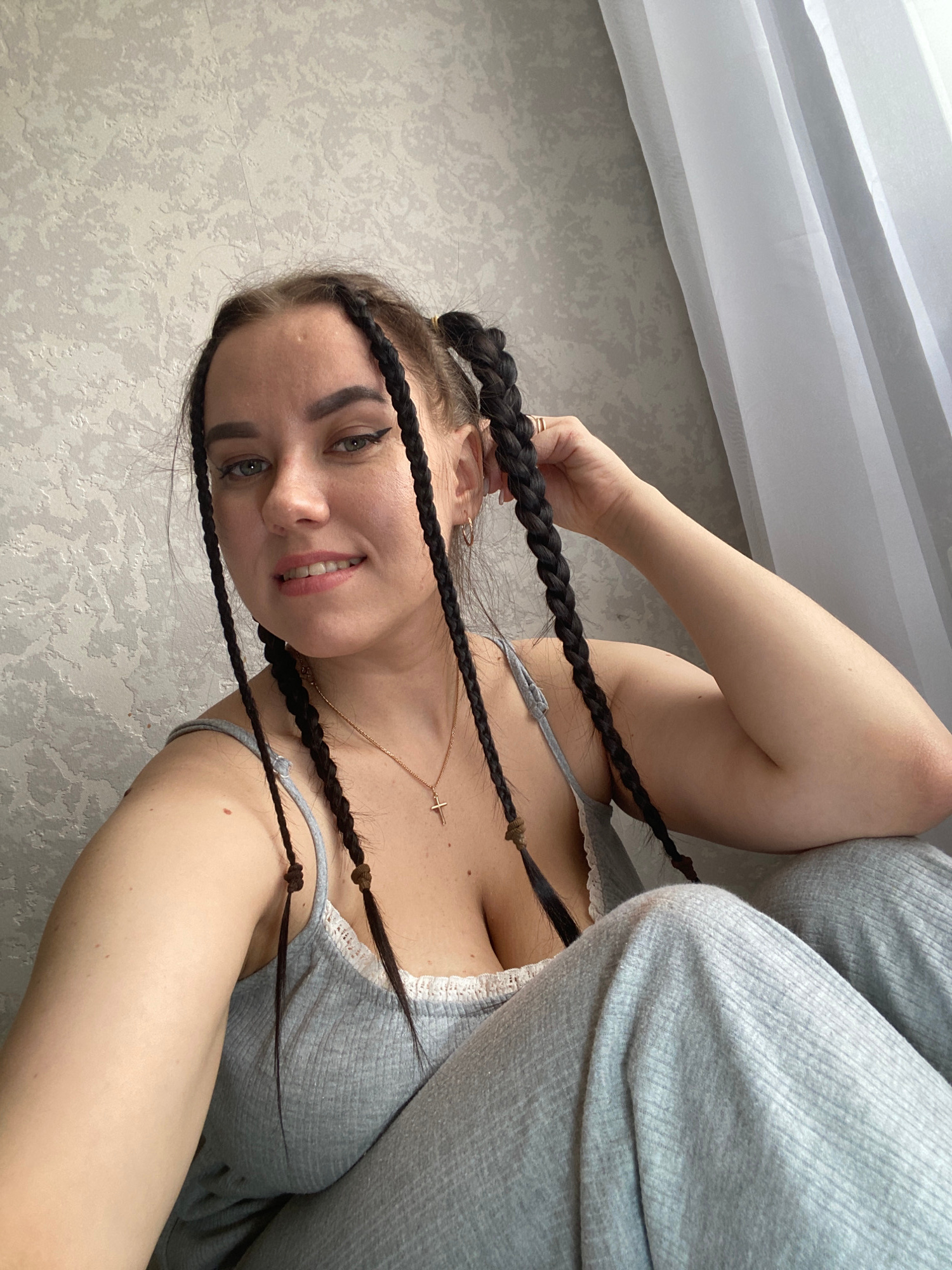 A fair-skinned woman with braided hair and dark eyeliner smiles at the camera. She wears a light gray top and pants. Her left hand is partially visible, holding one of her braids. A gold necklace with…read more