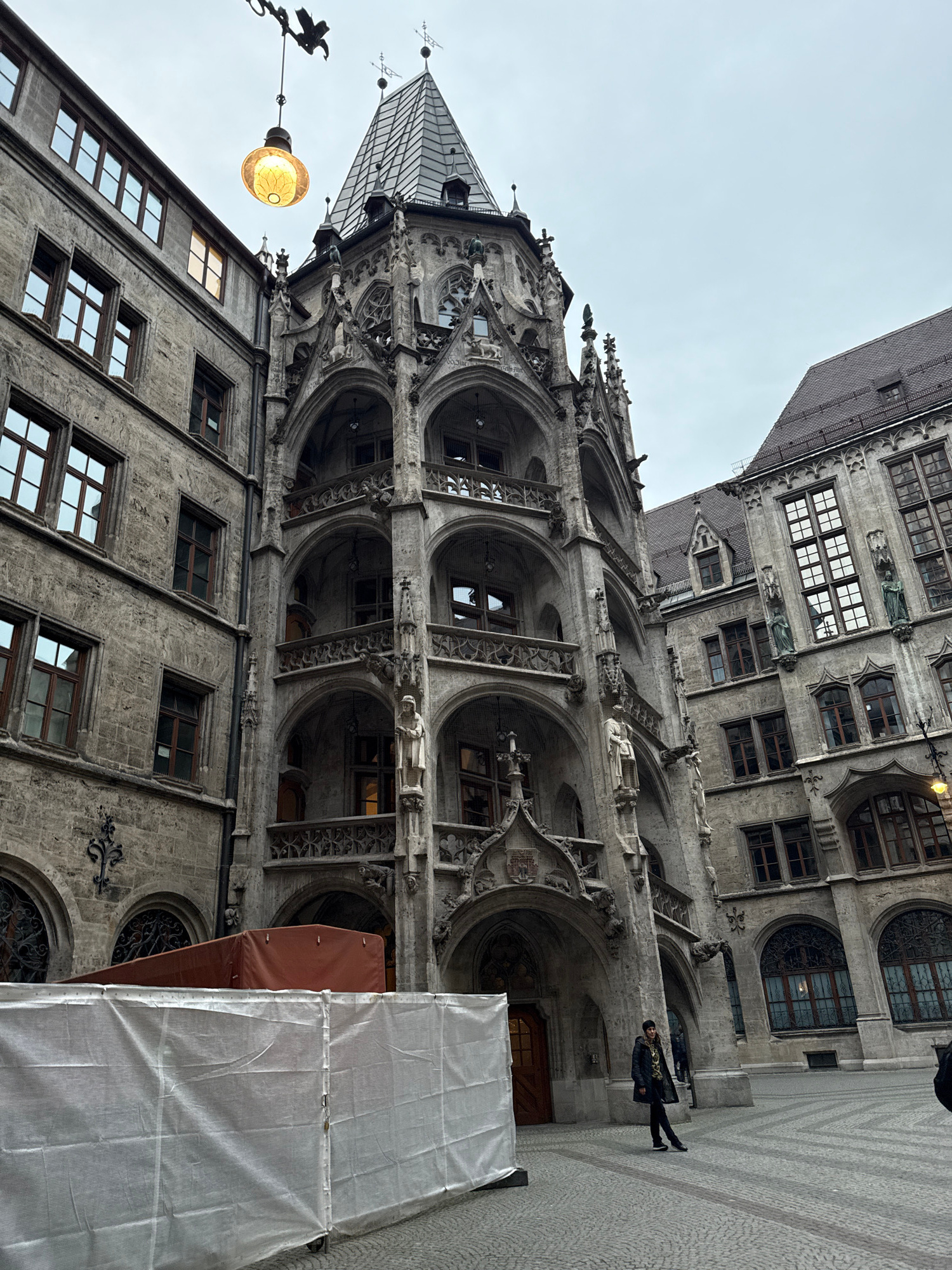 The image depicts a low-angle view of the Neues Rathaus (New Town Hall) in Munich, Germany. The architecture is primarily Gothic Revival with ornate carvings, arches, and windows. A portion of the bui…read more