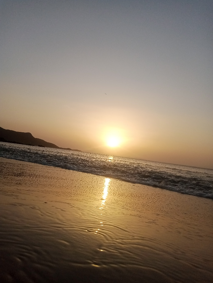 The image captures a coastal landscape in Juan Griego, Venezuela, during either sunrise or sunset. The sun, a prominent, luminous golden orb, is situated low on the horizon, slightly to the right of t…read more
