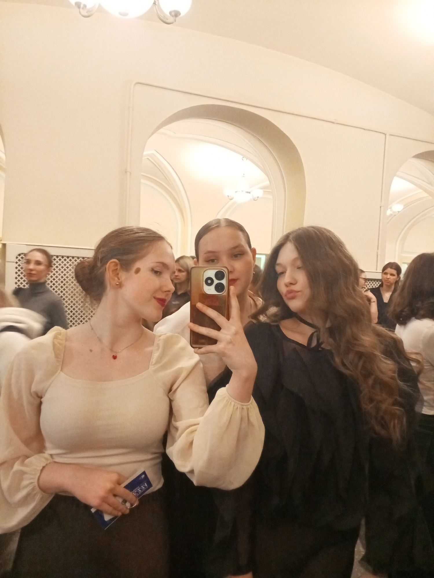 Three young women are posing for a selfie in what appears to be an ornate, high-ceilinged interior space. **People:** * **Woman on the left:** Light complexion, hair styled in an updo, wearing a l…read more