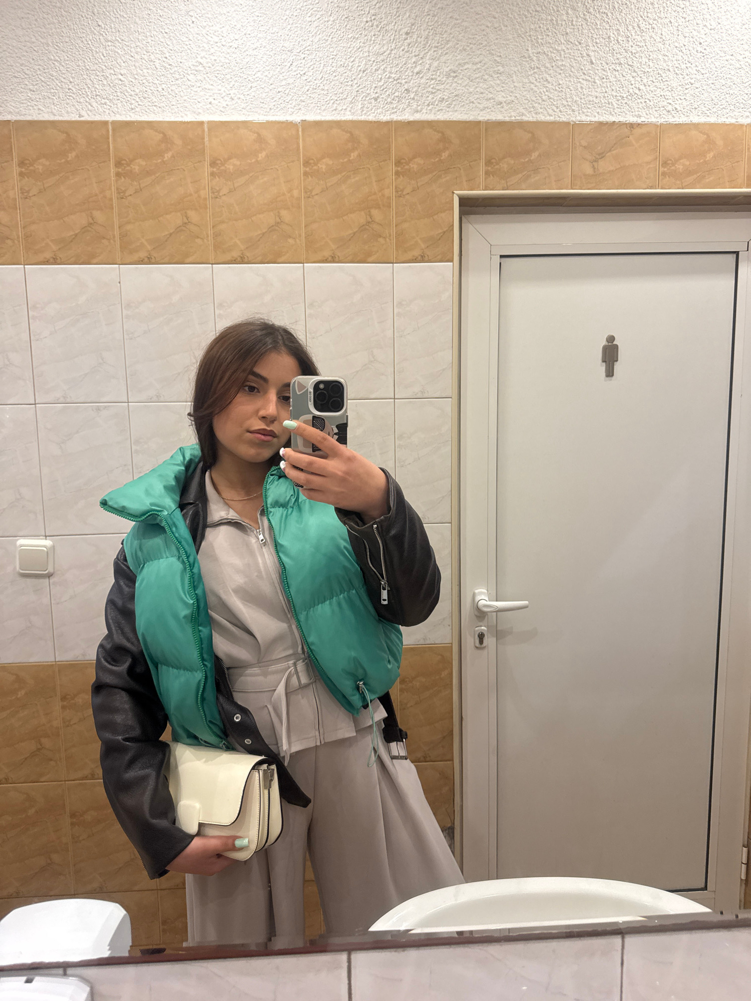 A young woman is taking a selfie in a restroom. The restroom features beige and white tiled walls, a white door with a gender symbol, and a white sink partially visible on the right. The woman wears a…read more