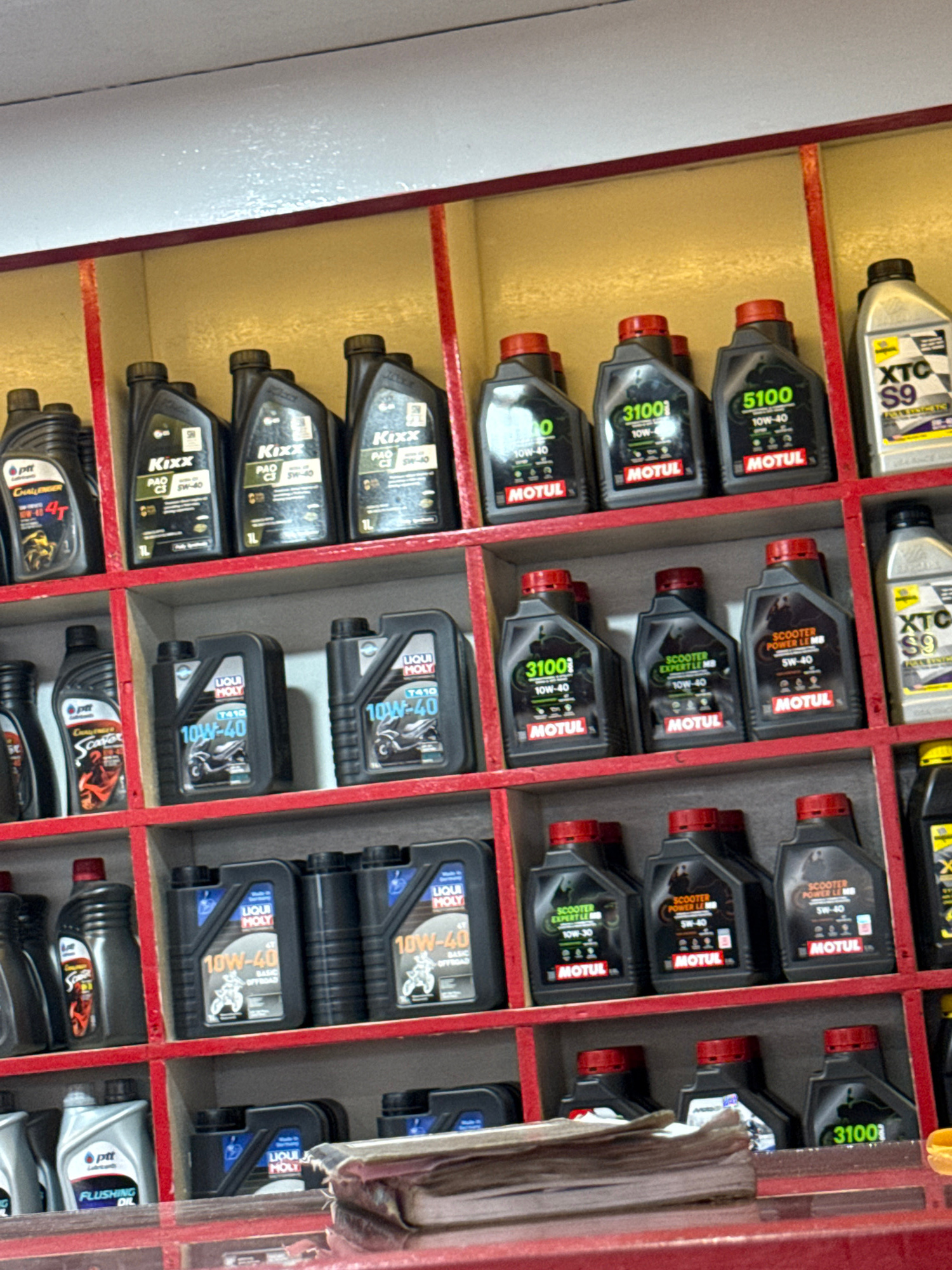 The image shows a display of various motor oils in a shop, likely in Lhokseumawe, Indonesia. The oils are arranged in a grid-like shelf system, with brands such as Motul, Kixx, Liqui Moly, and PTT vis…read more
