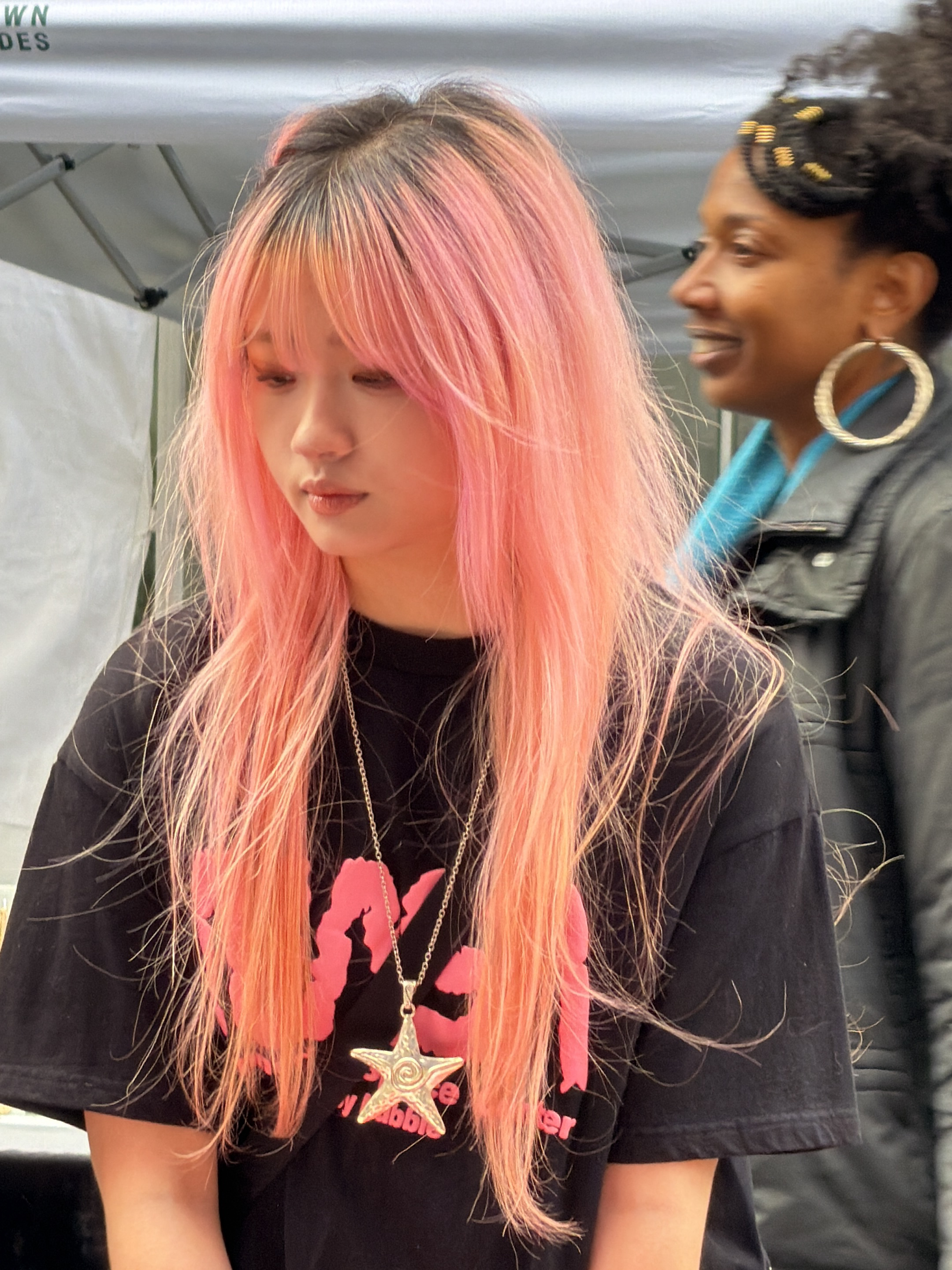 A young Asian woman with pink hair is standing outdoors in an unknown location, possibly in New York City. She is wearing a black t-shirt with a pink design and a silver necklace with a starfish penda…read more