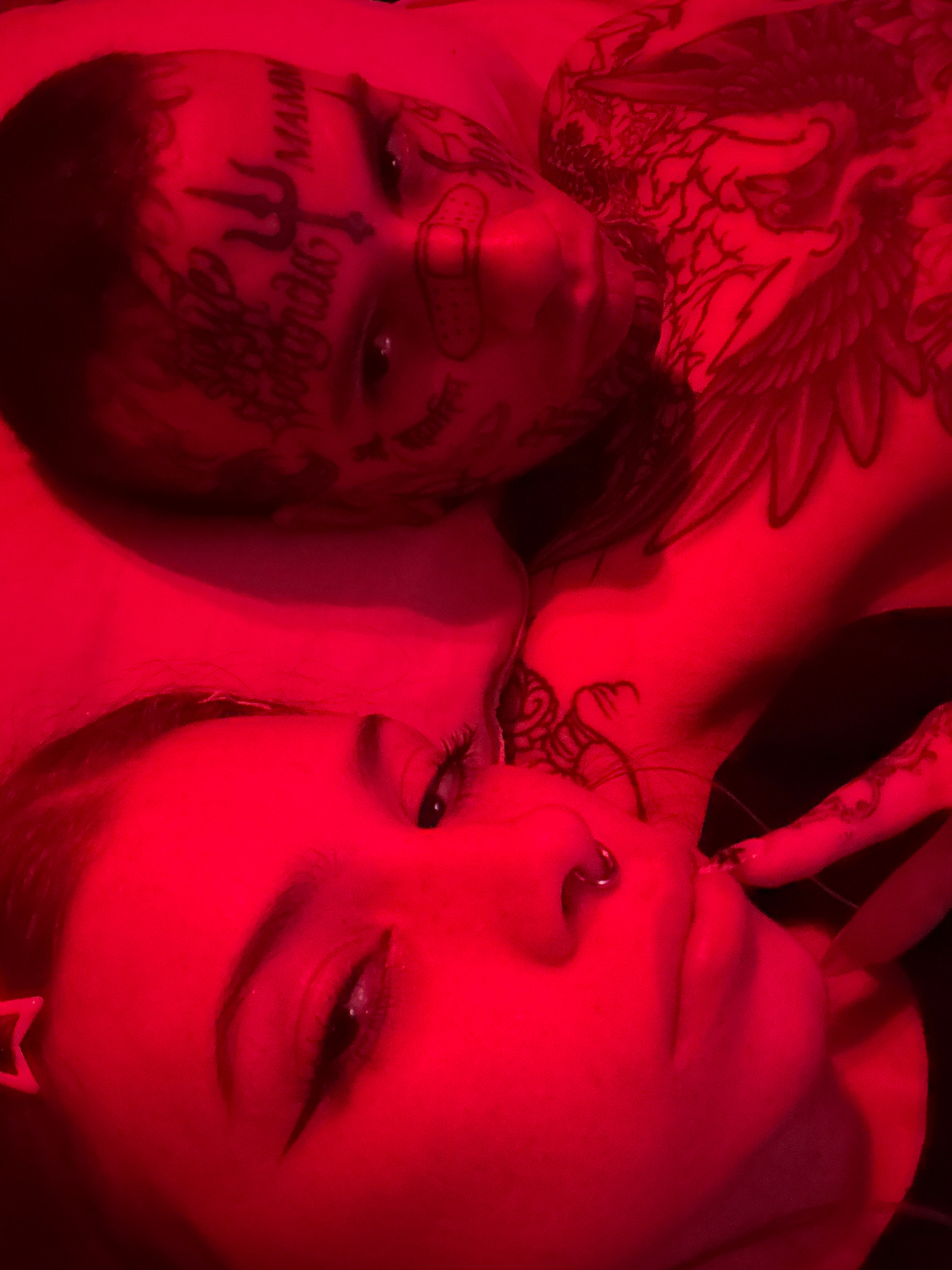 Two people are lying down next to each other, illuminated by red lighting. The person on the left has multiple face tattoos, including what appears to be the word "Miami" and a trident. The person on…read more