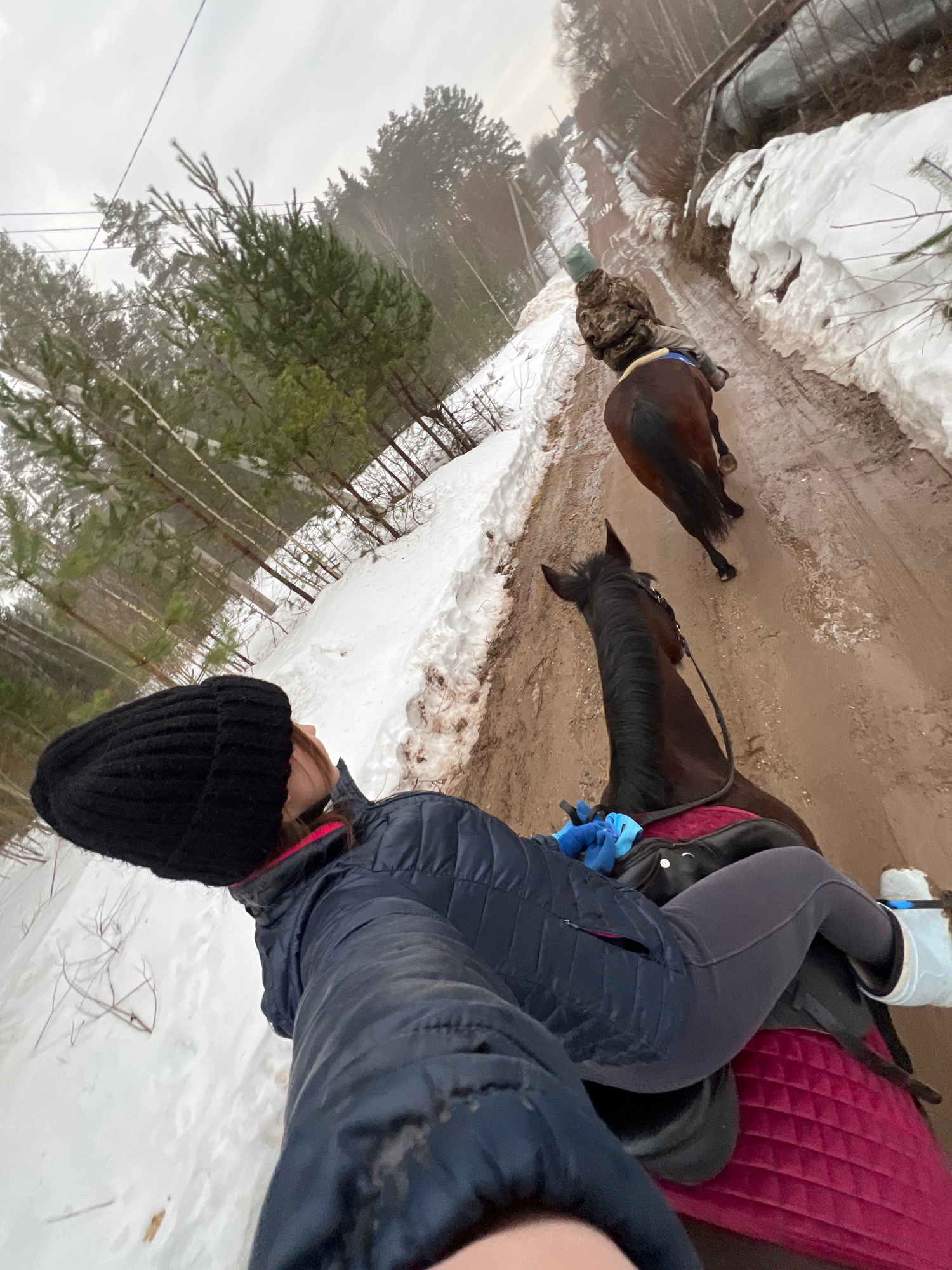 A person wearing a black beanie, a navy jacket, grey leggings, and boots is seen sitting atop a brown horse with a burgundy saddle pad. Another horse is walking in front. The location appears to be a…read more