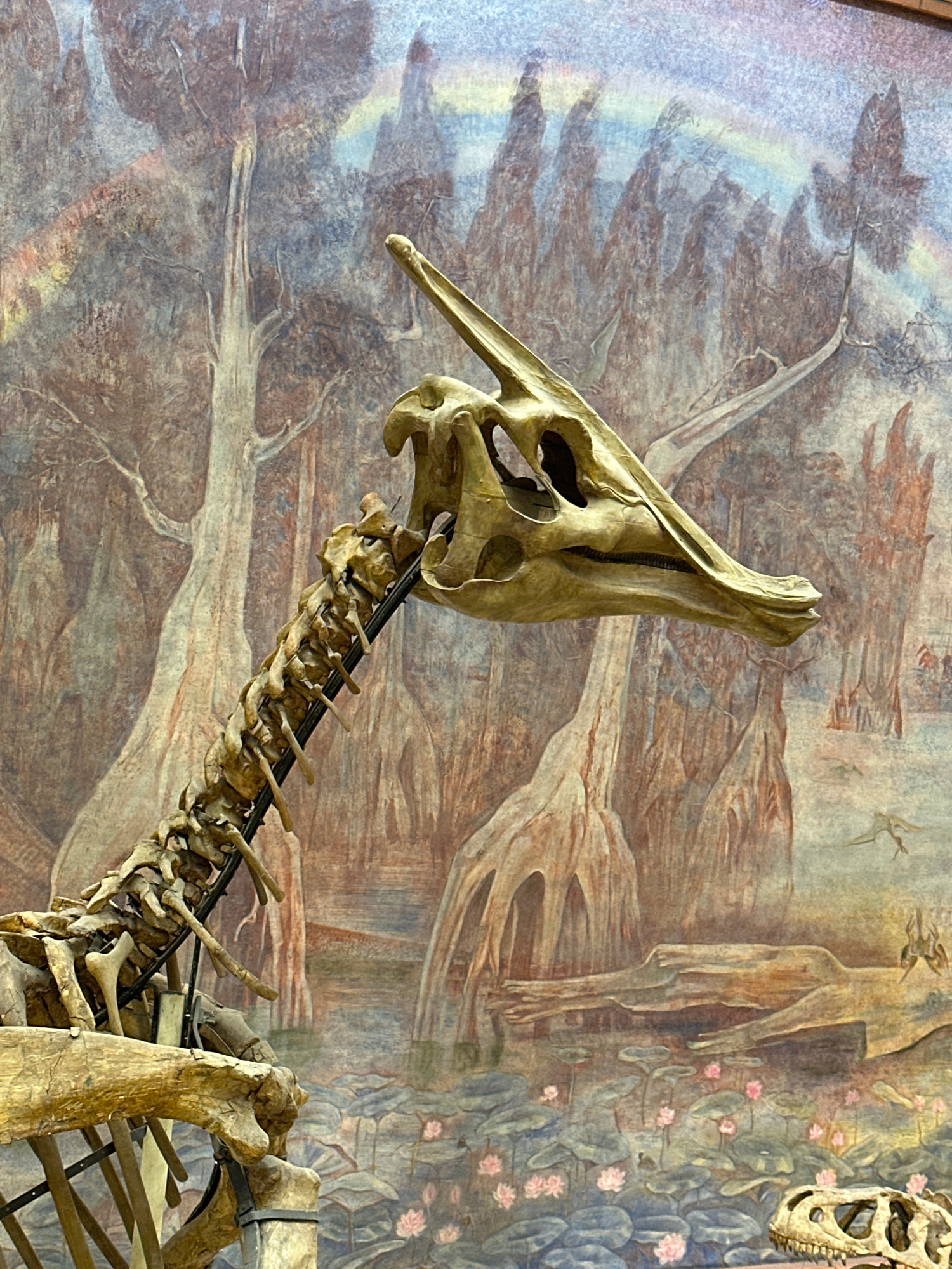 The image shows a skeletal reconstruction of a Parasaurolophus dinosaur, specifically the skull and neck vertebrae, displayed against a painted backdrop featuring stylized trees, figures, and flora. T…read more