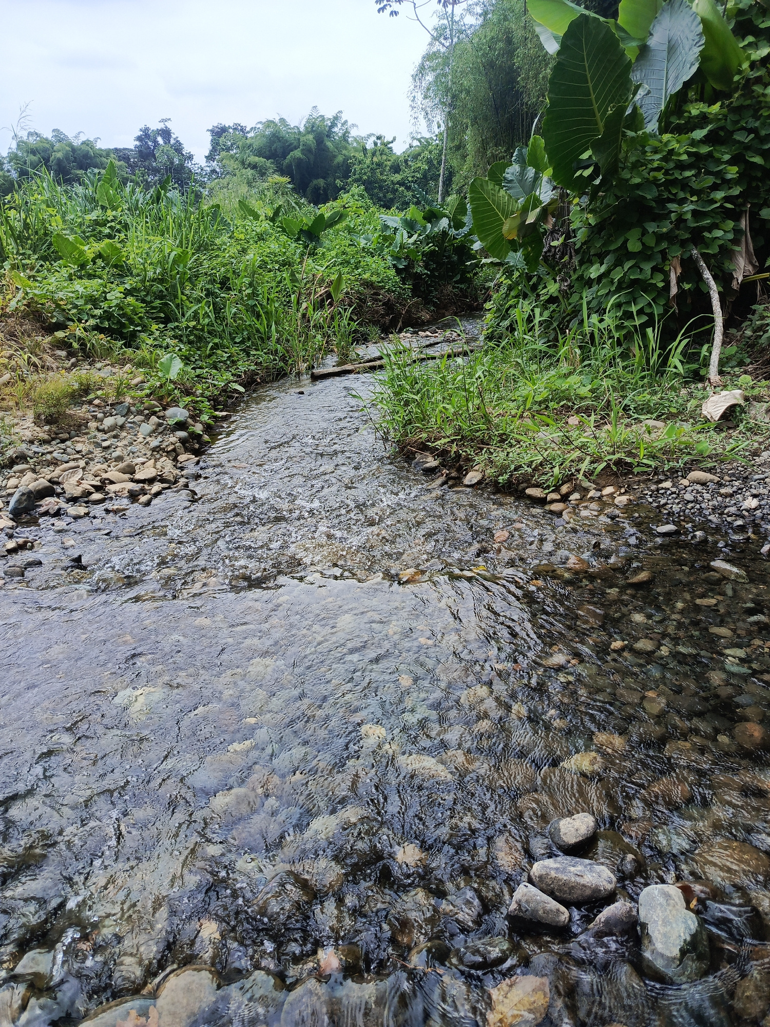 The image depicts a shallow stream flowing through a rocky streambed, flanked by lush vegetation. The water is clear enough to reveal the pebbles and rocks beneath the surface. The banks are lined wit…read more