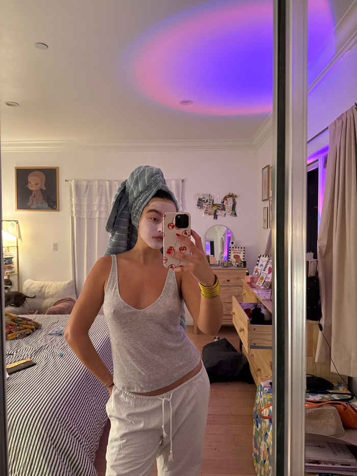 The image depicts a female subject taking a mirror selfie in a residential bedroom in Los Angeles, California, United States of America. The subject is a young adult female, standing upright, with he…read more