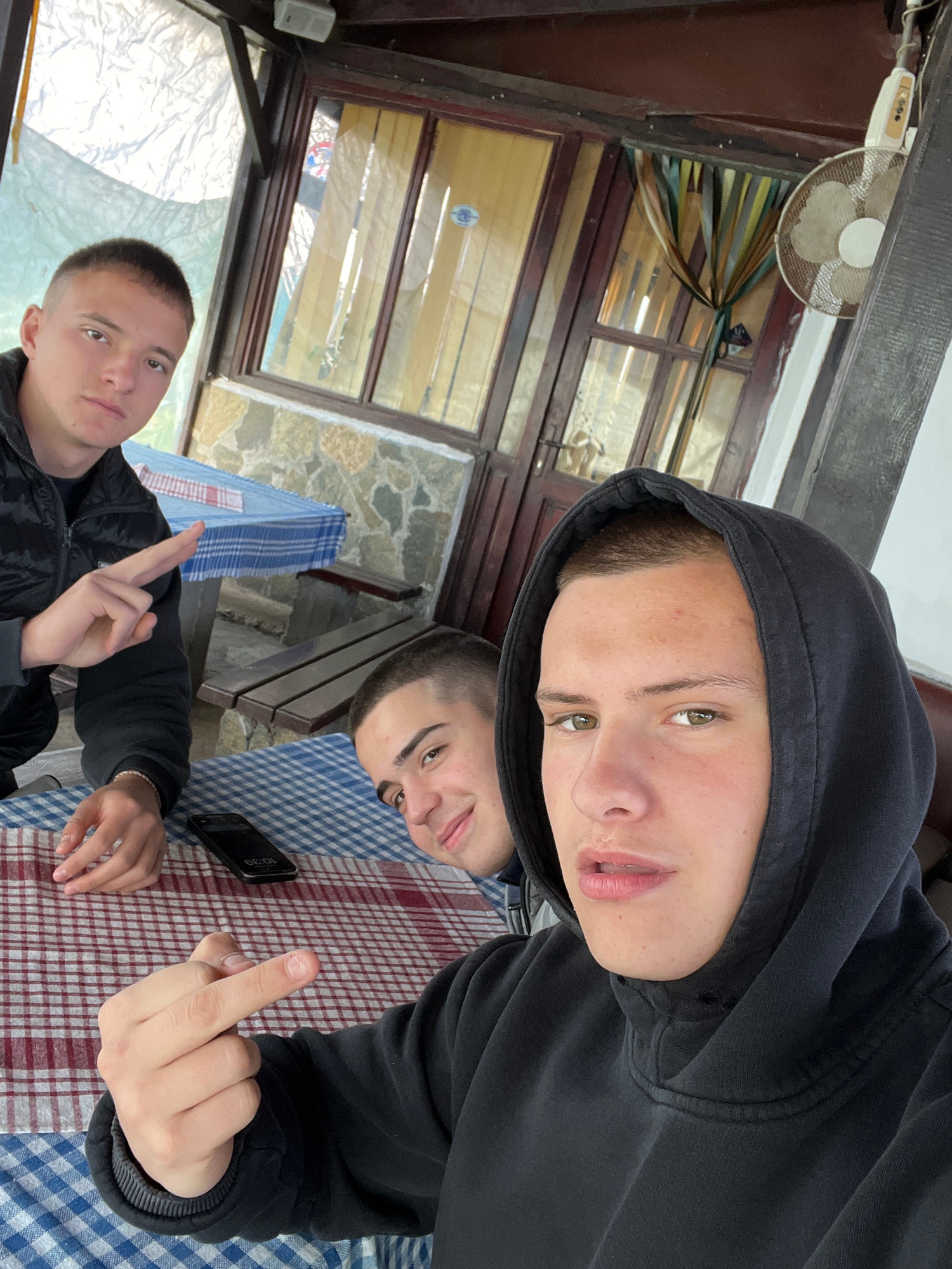 Three young males are visible in an outdoor setting. The individual in the foreground is wearing a black hooded sweatshirt and is extending their middle finger. To their right is a smartphone on a che…read more
