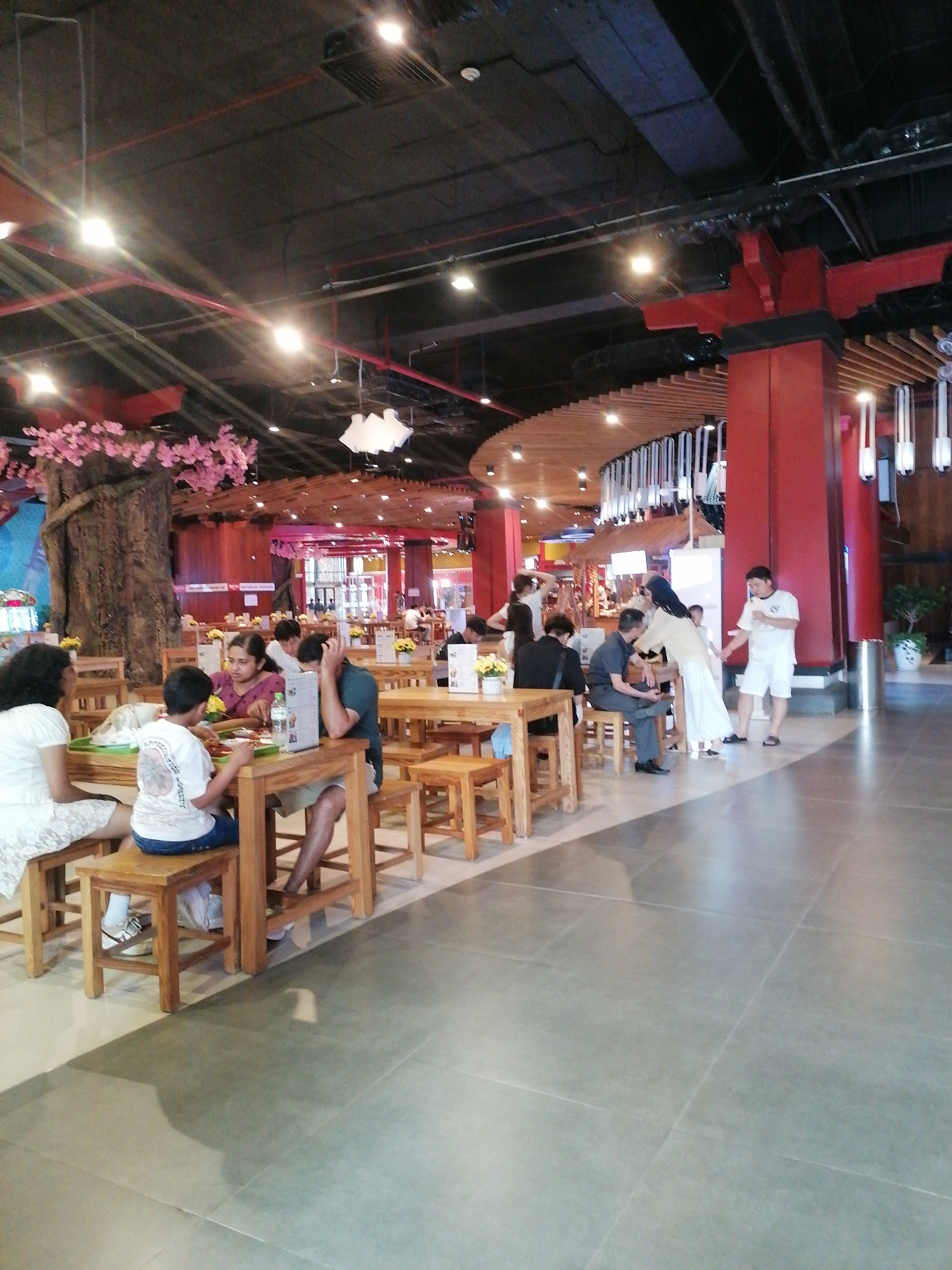 Captured in Hong Gai Ward, Vietnam, the image shows an interior dining area. Groups of people occupy wooden tables and stools. Several individuals are actively dining while others converse. Near the t…read more