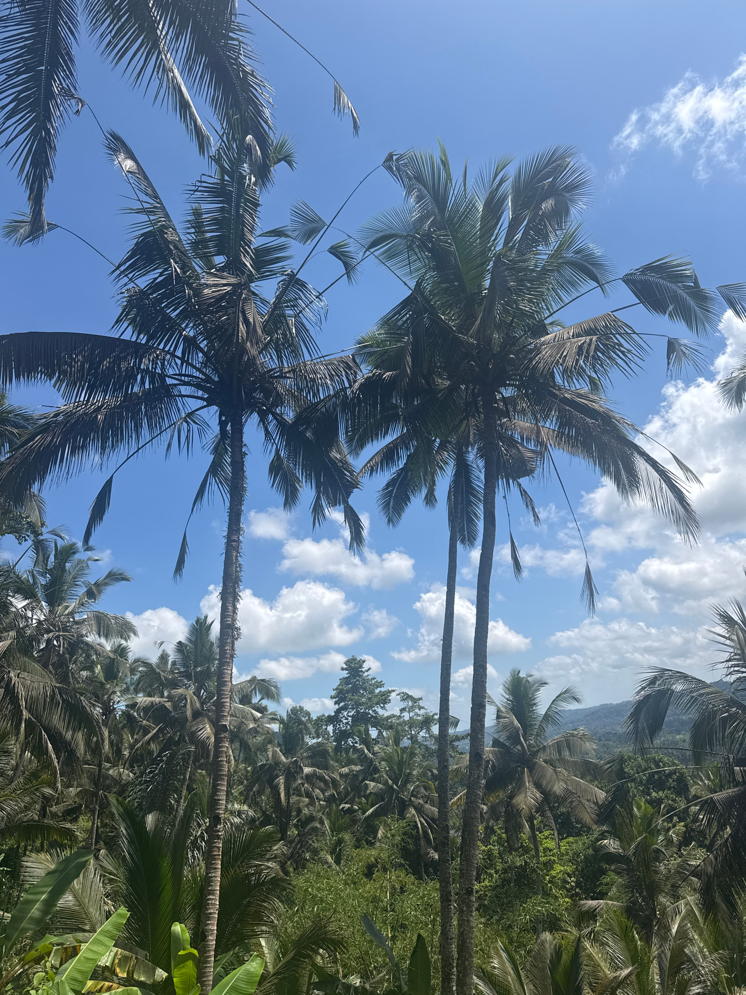 The image displays a vibrant tropical landscape in Sidemen, Indonesia, under a clear blue sky dotted with scattered white clouds. The scene is dominated by numerous tall coconut palm trees, with sever…read more