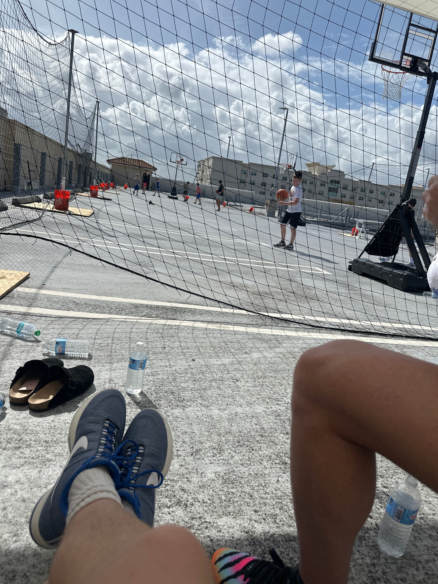 The image presents a view of a basketball court in Aventura, Florida, United States. The foreground shows a person wearing blue sneakers and white socks. Near this person are a water bottle and a pair…read more