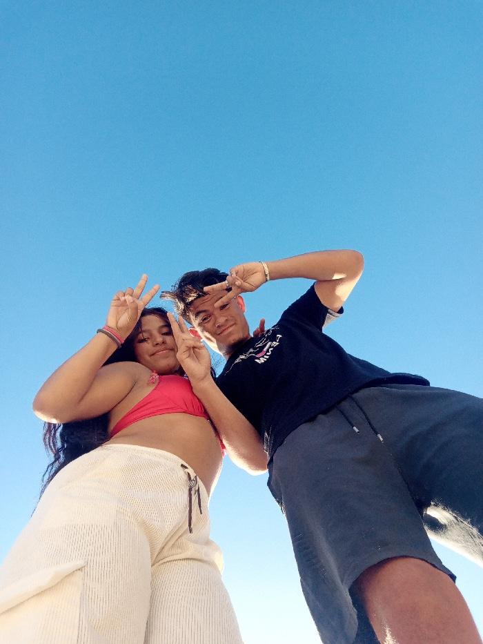A couple poses against a bright blue sky. The woman, wearing a red bikini top and white pants, holds up a peace sign. Beside her, a man in a black t-shirt and gray shorts mirrors the gesture. The low-…read more