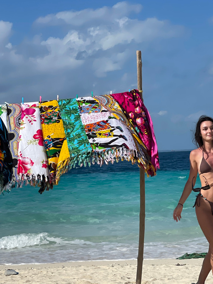 A woman in a bikini poses by a beachside display of colorful sarongs hanging from a wooden pole. The sarongs feature vibrant patterns, including floral, palm tree, and geometric designs. Turquoise wat…read more