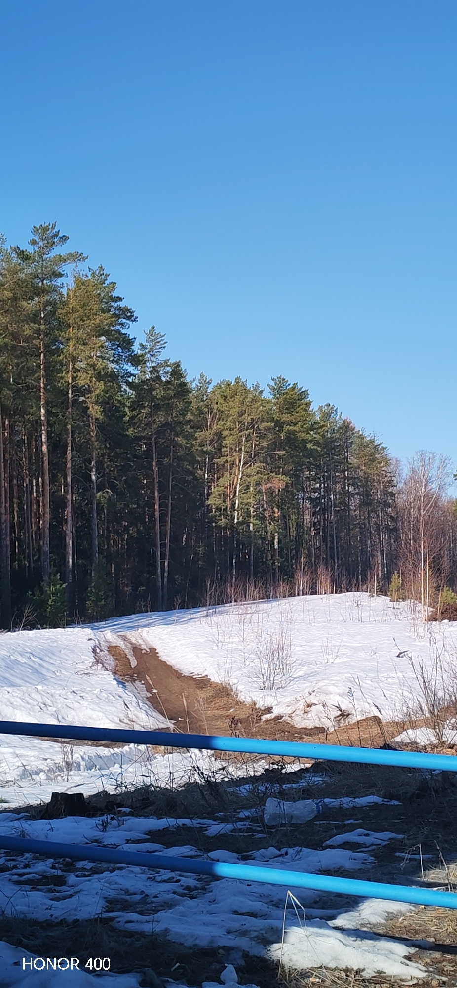 The image depicts a snowy landscape in Noviy, Russia, on a sunny day. A dense forest of tall pine trees occupies the left side of the frame, bordering a snow-covered field. A dirt path cuts through th…read more