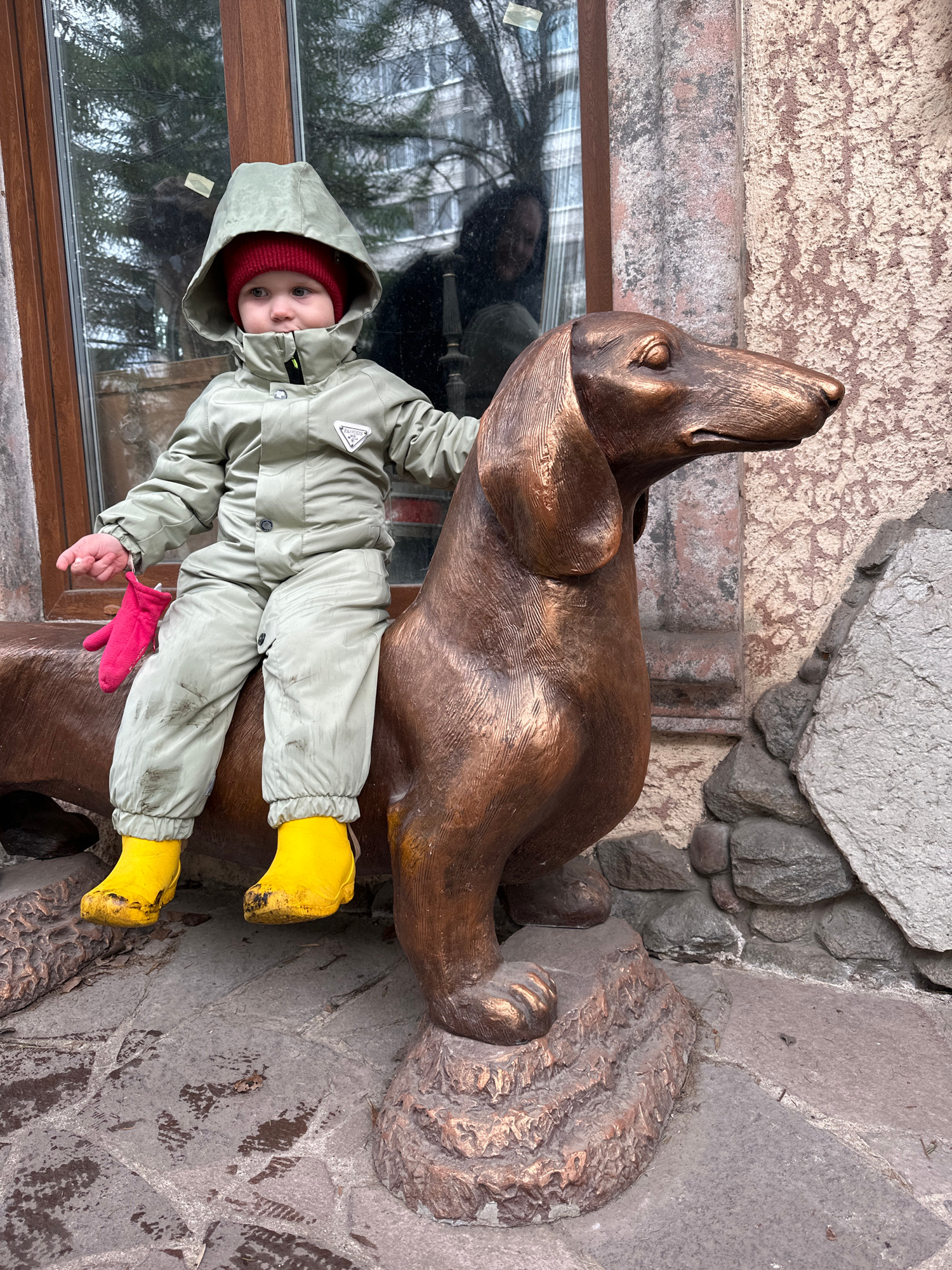 A child wearing a light green snowsuit, a red hat, and yellow boots lies on a bronze sculpture of a seal. The child has a red mitten in their hand. The sculpture is located outside a building with sto…read more