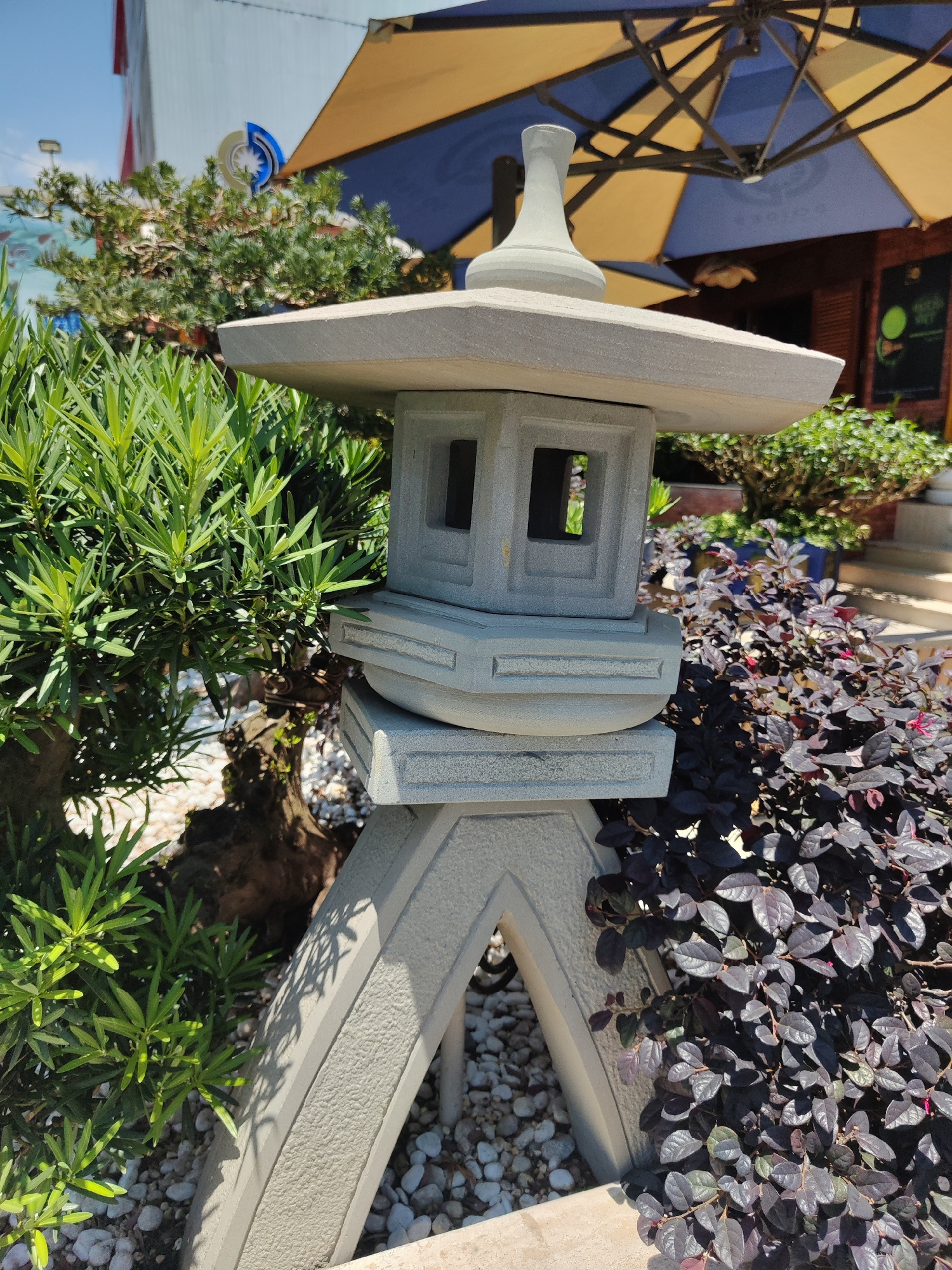 This image shows a stone lantern, traditionally used in Japanese gardens, located in what appears to be a garden setting in Cam Ly - Đà Lạt, Vietnam. The lantern is gray, composed of a base with arche…read more