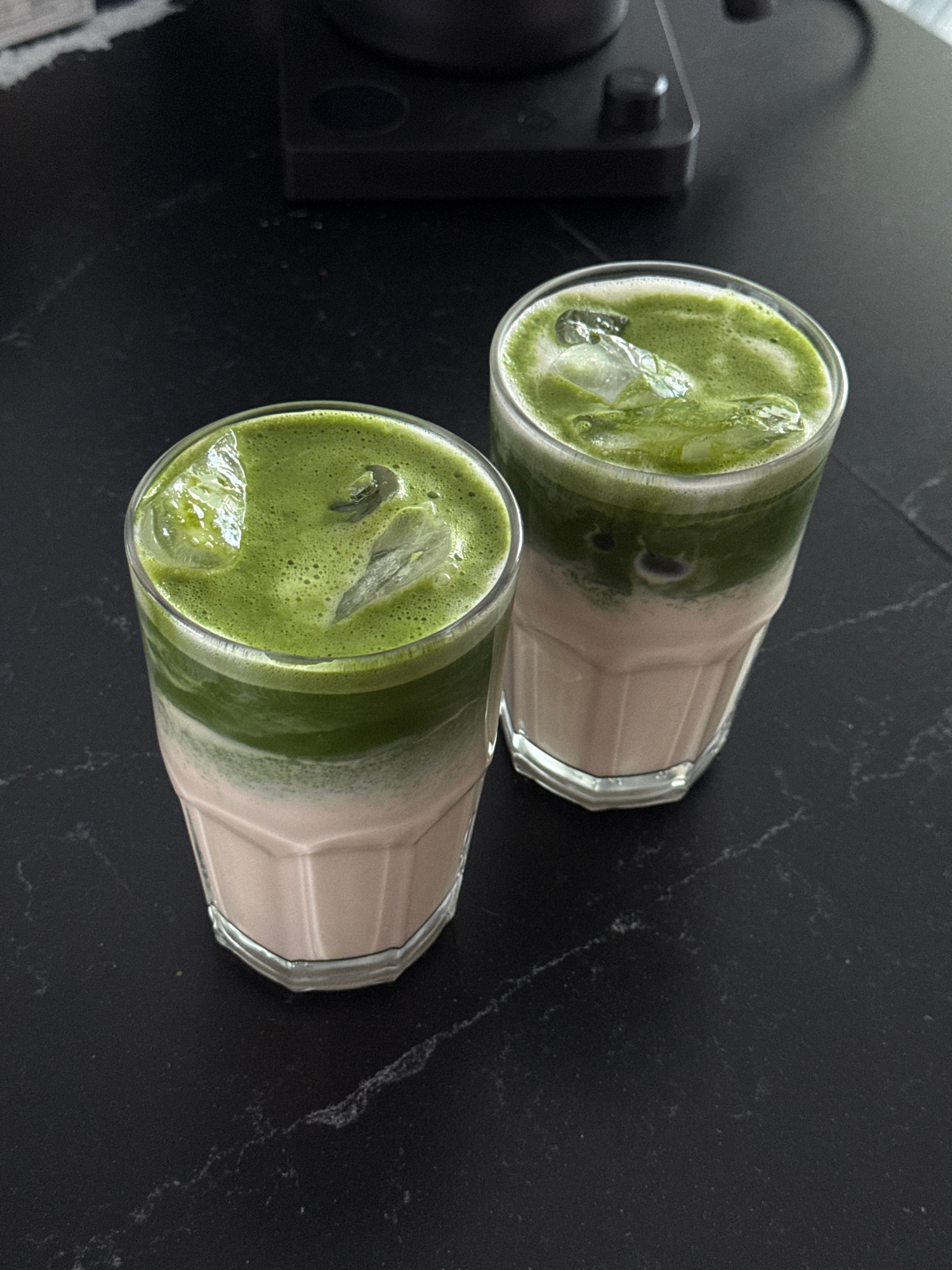 Two glasses of layered matcha lattes with ice are positioned on a black countertop with faint white marbling. To the left of the glasses, partially visible, is a black electronic device with dials. Th…read more