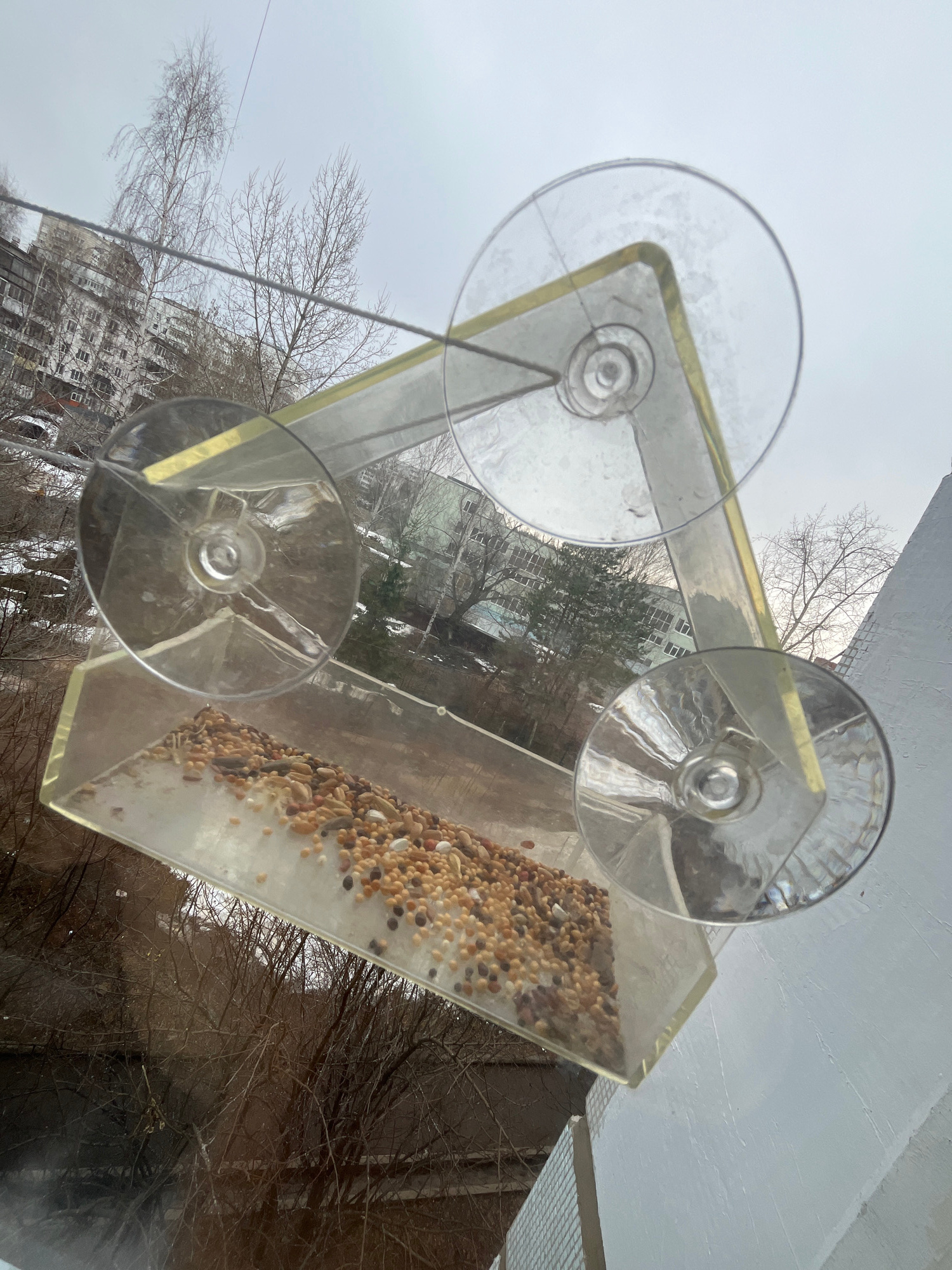 The image depicts a clear plastic bird feeder attached to a window, filled with birdseed. The feeder is affixed with three suction cups. Outside the window, a cityscape can be observed, including buil…read more