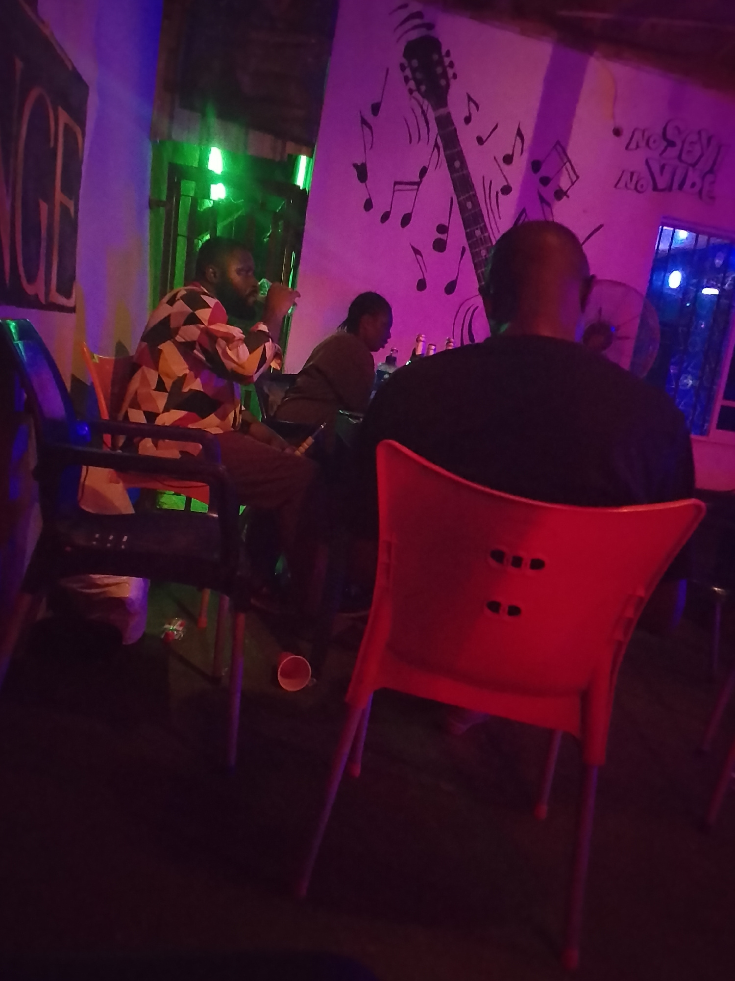 The image shows an indoor scene in what appears to be a bar or lounge, possibly in Yelwa, Nigeria. Three people are visible. One man is sitting in the foreground with his back to the camera, wearing a…read more