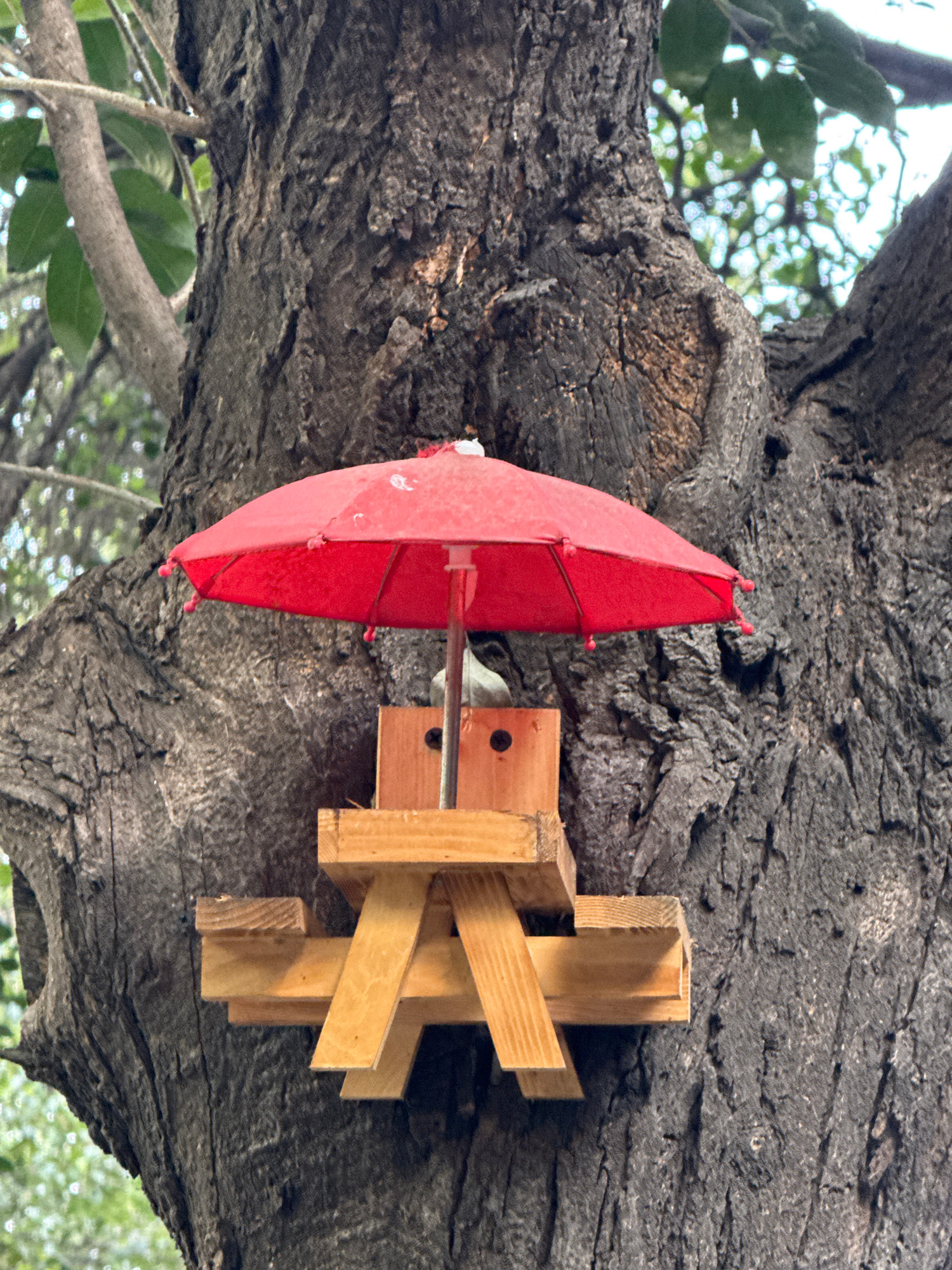 A red umbrella is attached to a wooden contraption that is attached to a tree. The background is a tree trunk and leaves. The location is Mexico City, Mexico.