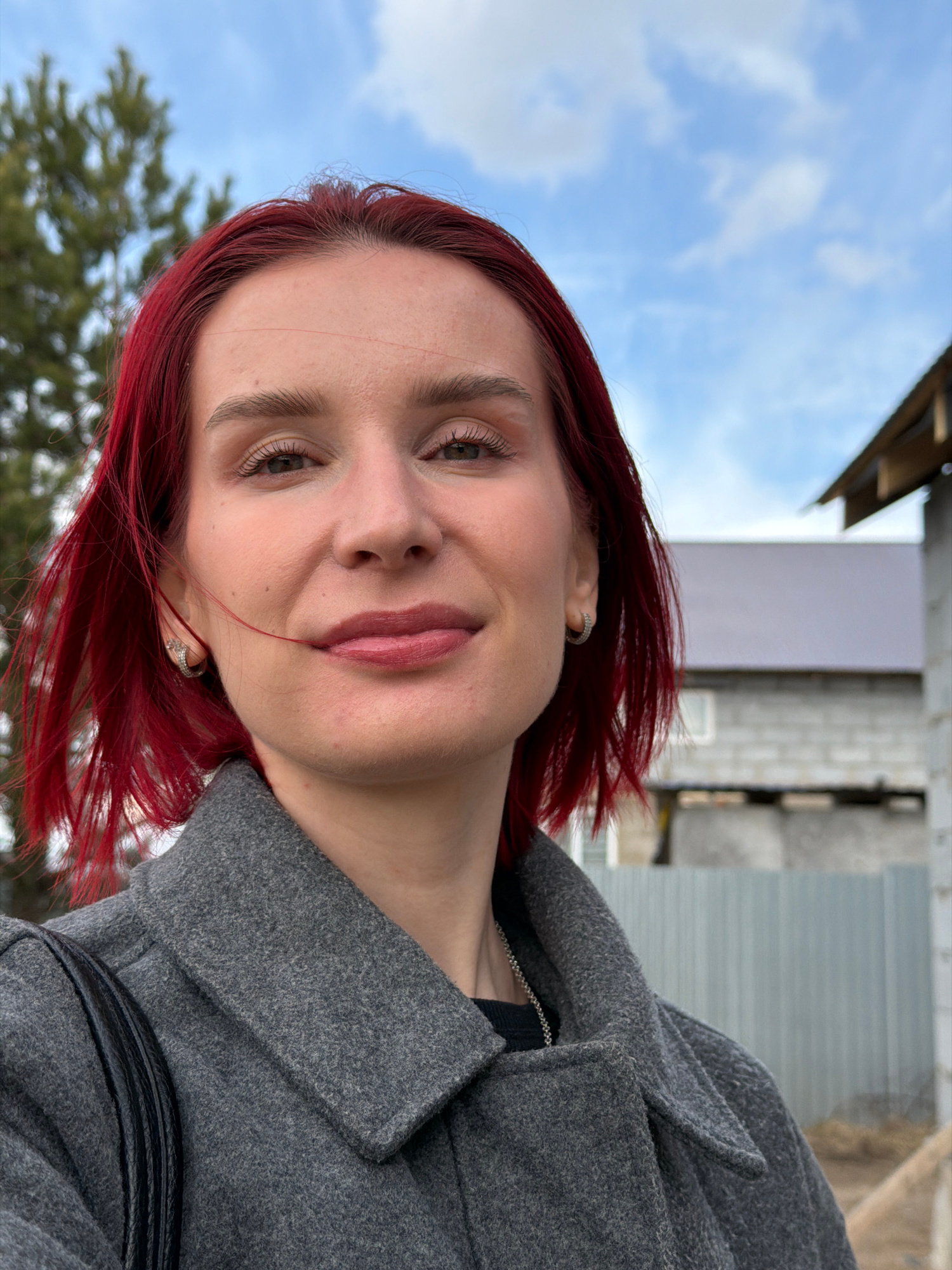 The image displays a head-and-shoulders portrait of a young woman taken outdoors in Chaikovsky, Russia. The photograph is oriented 90 degrees counter-clockwise. The subject is a young woman with dist…read more