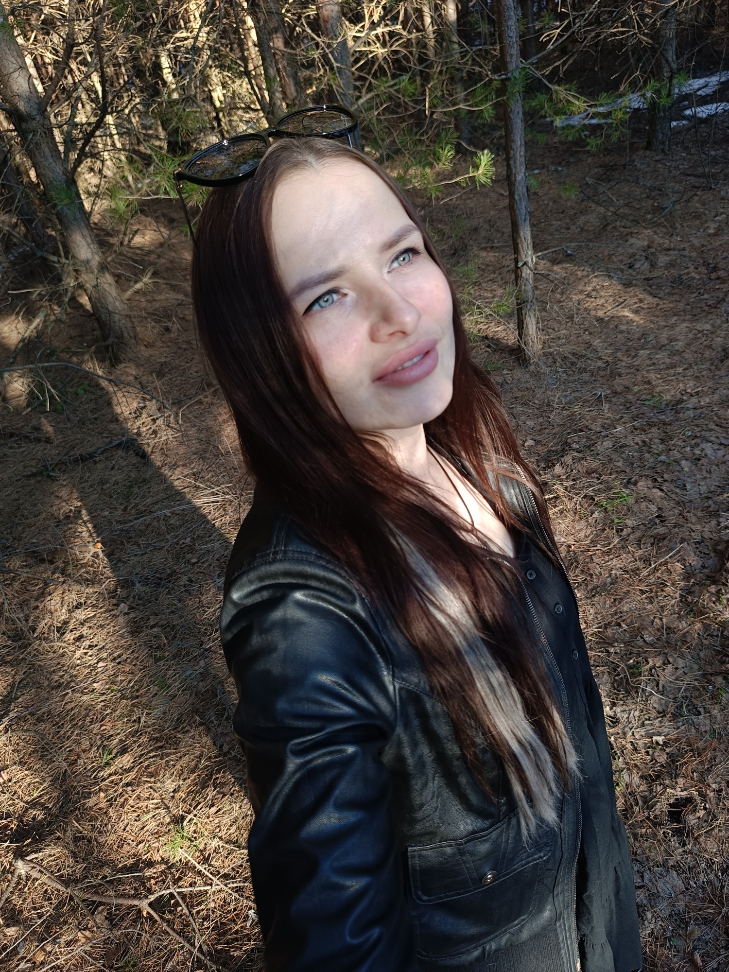 A young woman is captured in a selfie-style shot within a coniferous forest or wooded area, consistent with the landscape of Chaikovsky, Russia. She has long, dark brown hair, with lighter streaks, fa…read more