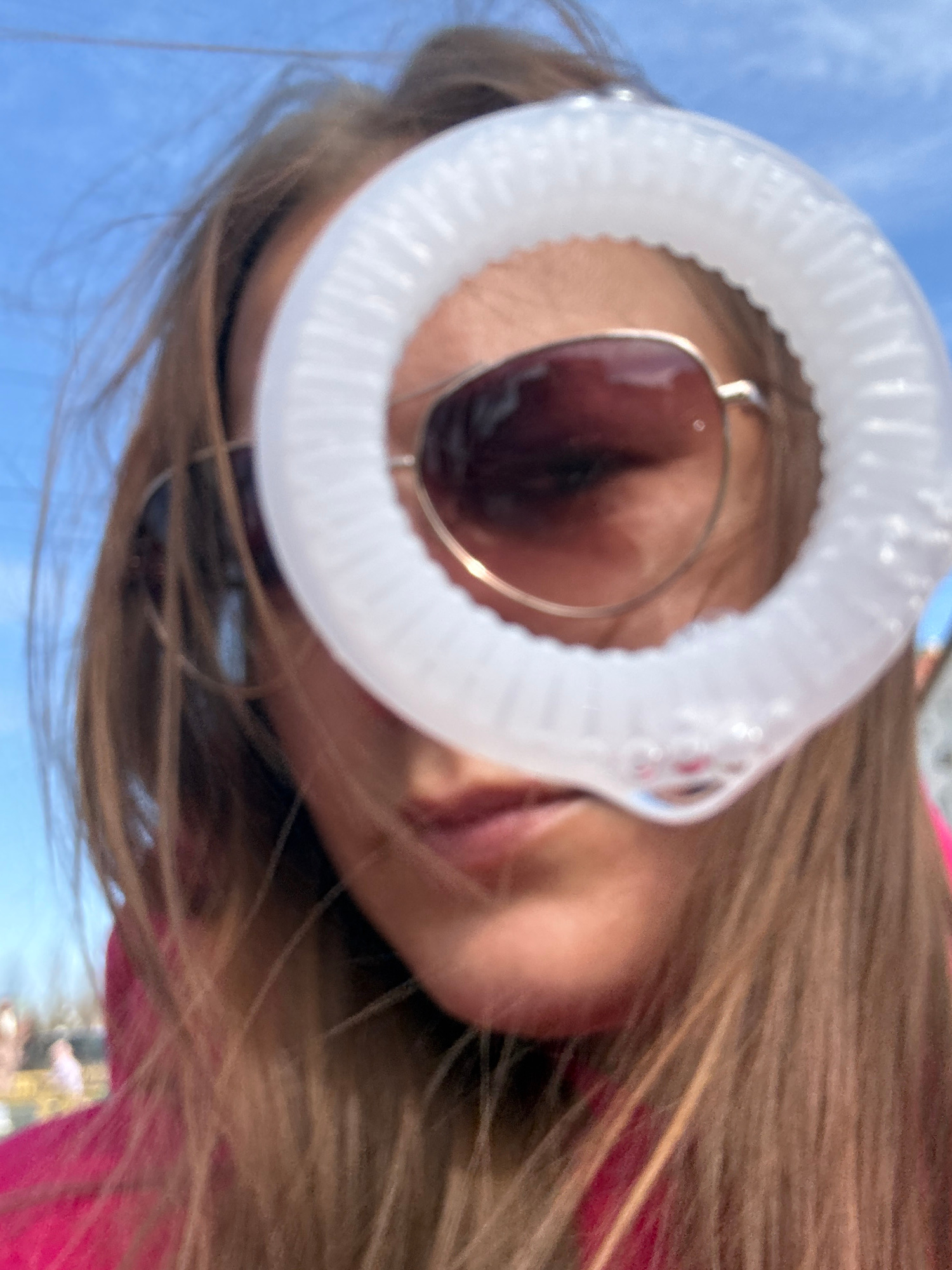 A low-angle shot of a fair-skinned person with long brown hair wearing a pink top. The person holds a white, ring-shaped object with a clear center up to their eye, distorting and partially obscuring…read more