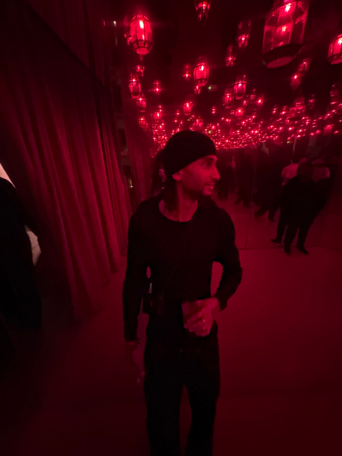 The image captures an indoor scene dominated by deep red illumination, consistent with the distinctive "red room" interior of the Gucci Osteria da Massimo Bottura in Milan, Italy. A male individual, eā¦read more