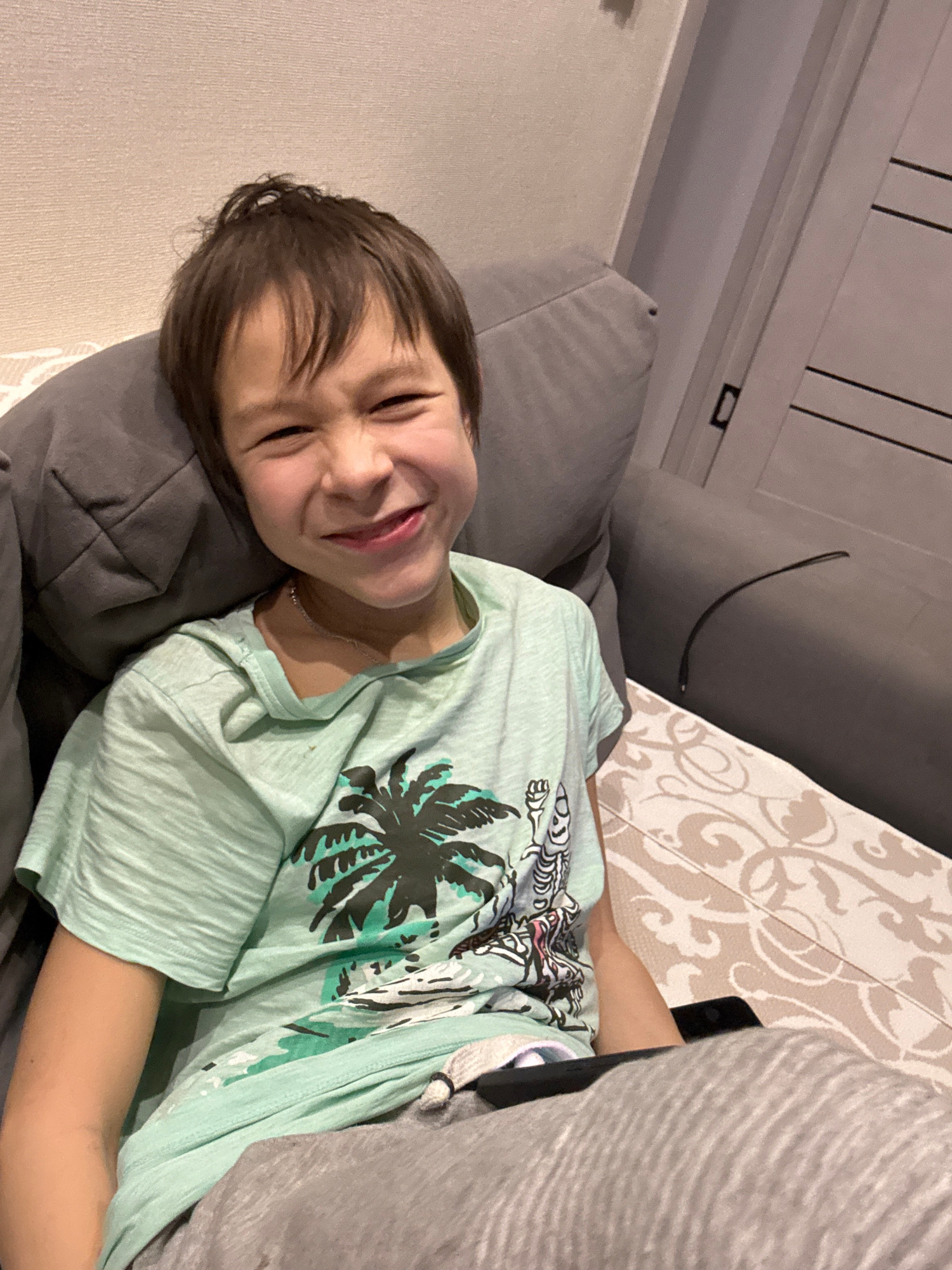 A boy is lying on a gray sofa. He is wearing a light green t-shirt with a palm tree design. He is smiling and squinting his eyes. Part of a table with a patterned surface is visible next to the sofa.…read more