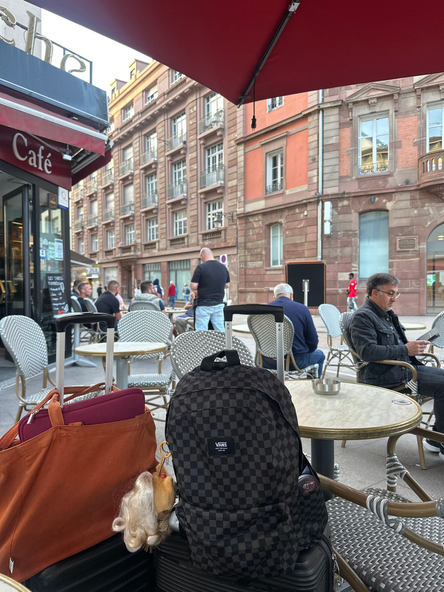 The image shows an outdoor cafe scene in Strasbourg, France, judging by the signage. Diners are seated at round tables with white wicker chairs, some holding phones and interacting. Architectural deta…read more