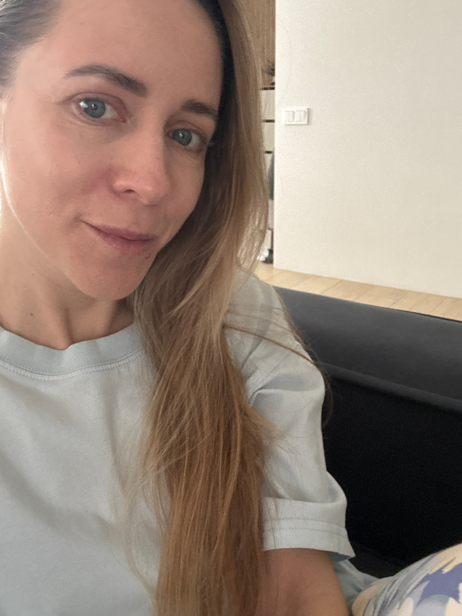 A woman with fair skin and light brown hair is taking a selfie. She is wearing a light blue t-shirt. The background consists of a white wall with an electrical outlet, a dark colored sofa, and a pillo…read more