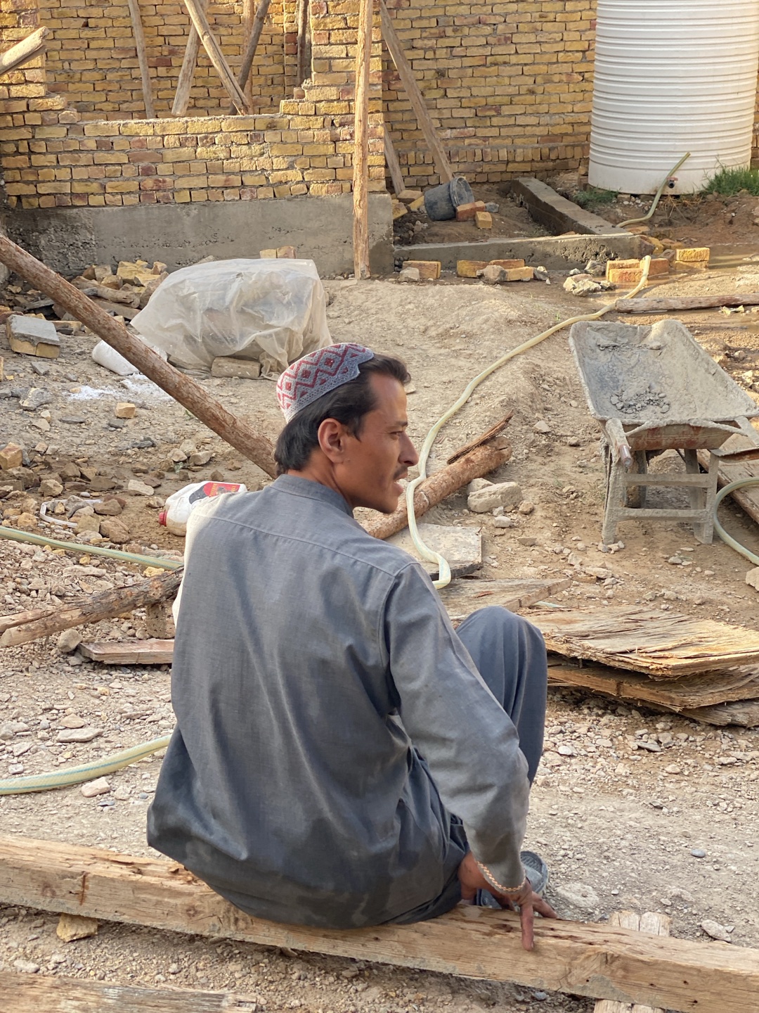 The image shows a man sitting on a wooden beam in what appears to be a construction site. The man is wearing a gray outfit and a traditional Afghan hat. Behind him are a brick wall under construction,…read more