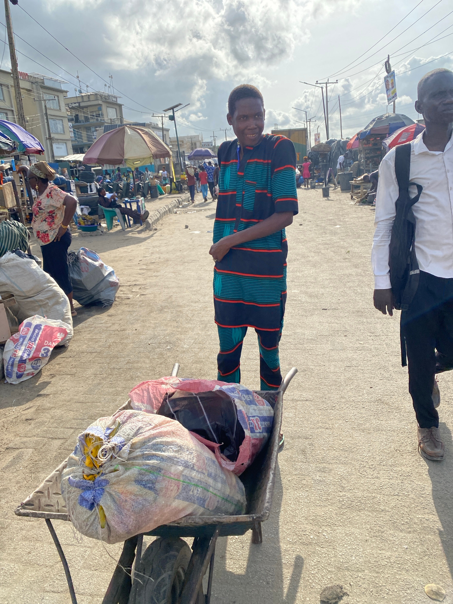 The image depicts a street scene in Lagos, Nigeria. A young man in a striped shirt and pants stands next to a wheelbarrow filled with sacks. An older man in a white shirt stands slightly behind him. T…read more