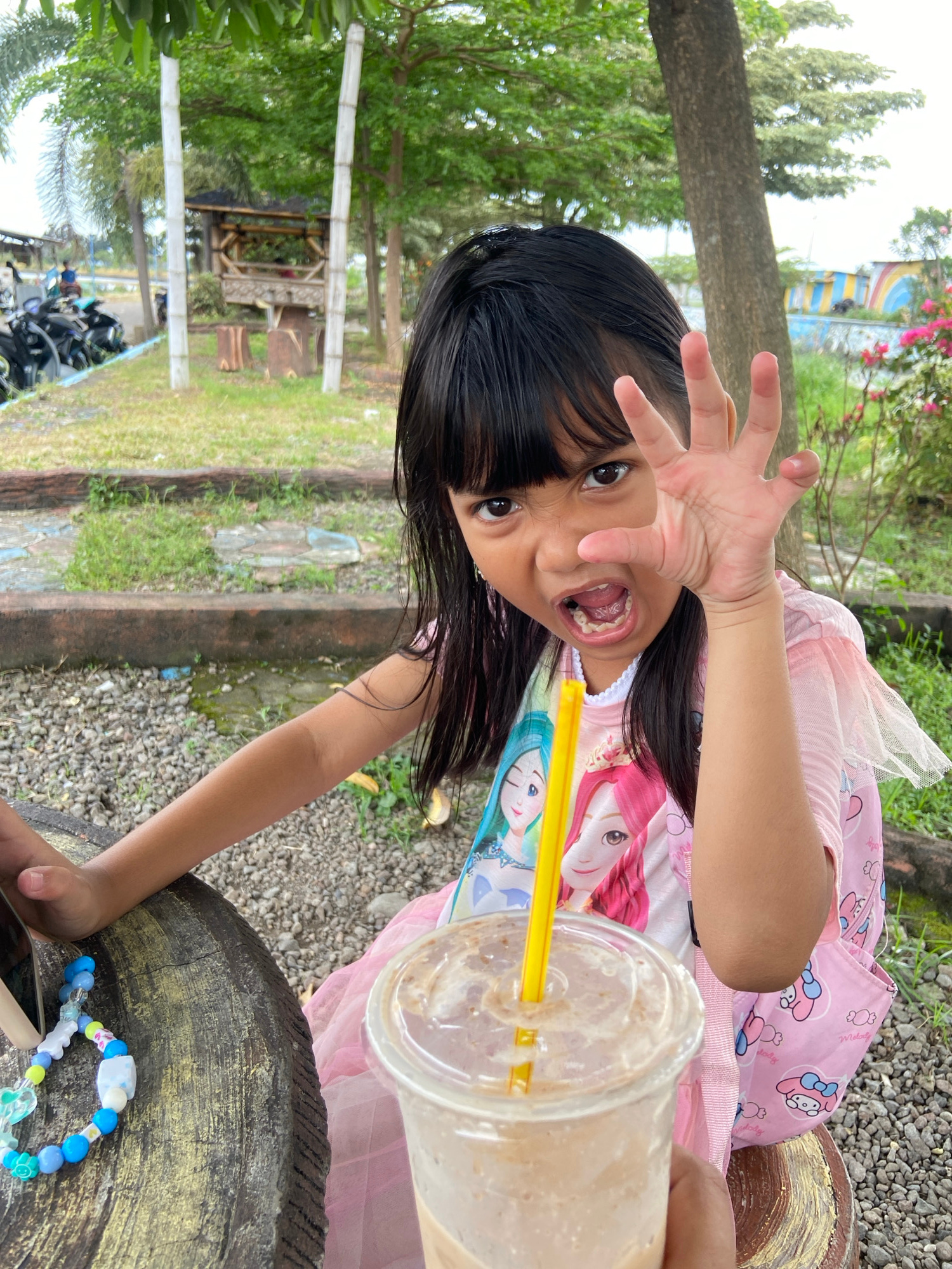 A young girl is prominently featured, playfully extending one hand towards the camera with fingers spread, while holding a large plastic cup containing a brown beverage with a yellow straw in the othe…read more
