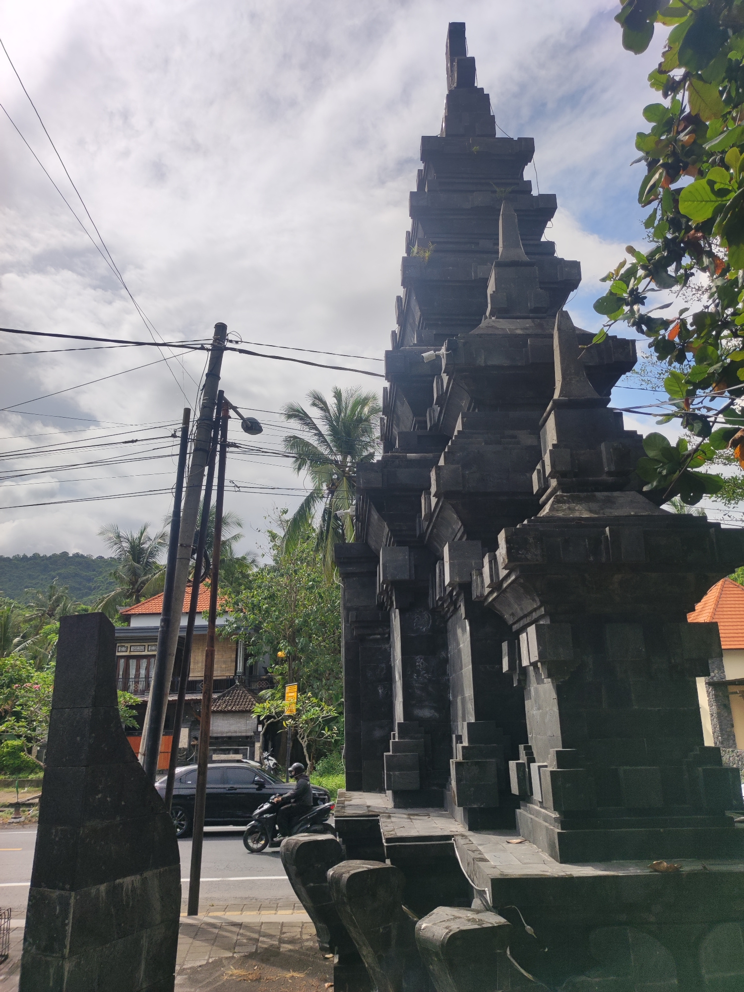 A ground-level, daytime shot captures a weathered, gray stone Balinese gate in Padangbai, Indonesia. A motorcyclist wearing a helmet rides past the gate on a paved road with a black car driving behin…read more