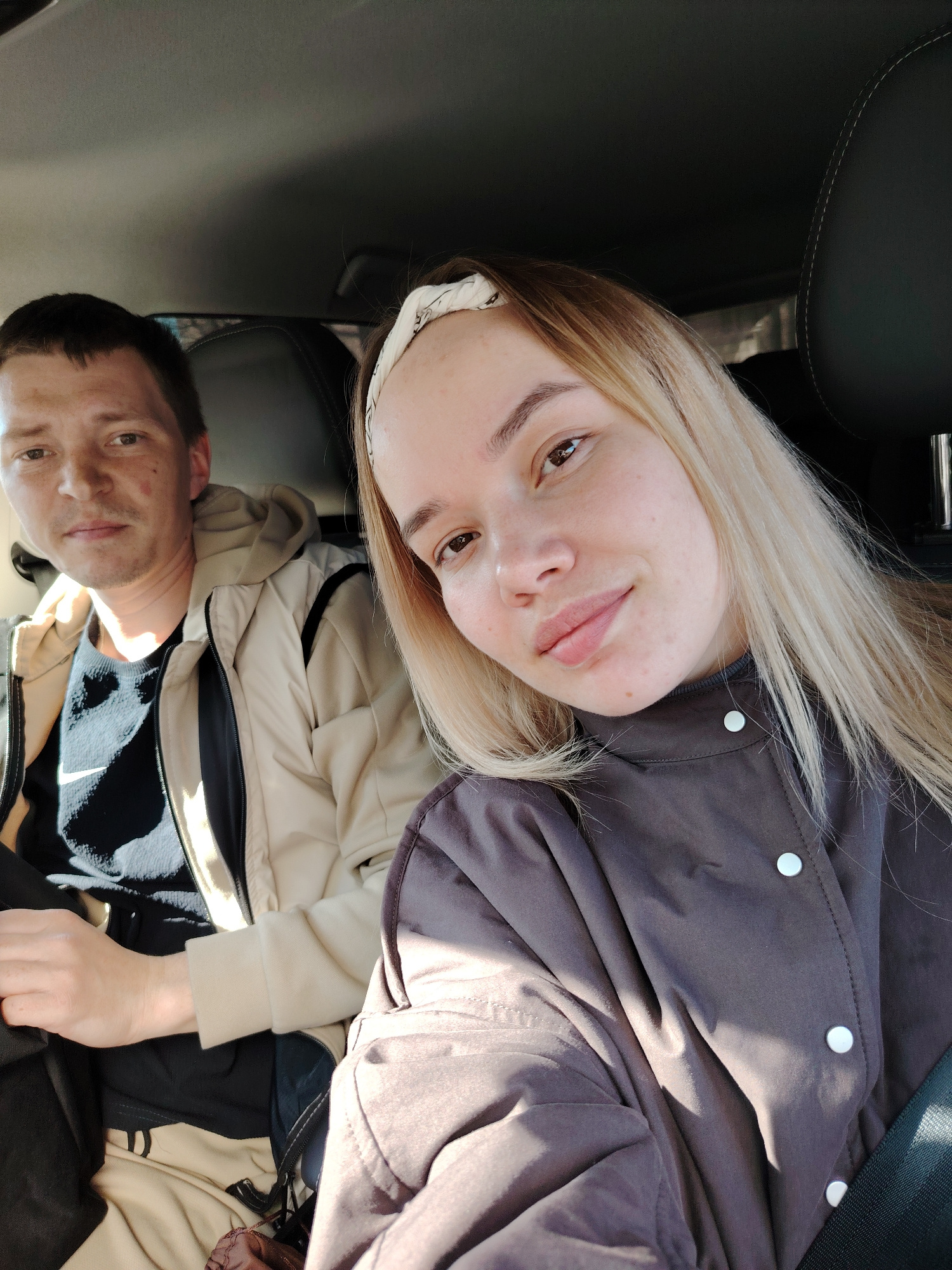 Two individuals are inside a car. A man with short brown hair is on the left, wearing a light brown jacket over a black and white shirt. A woman with blonde hair and a white headband is on the right,…read more