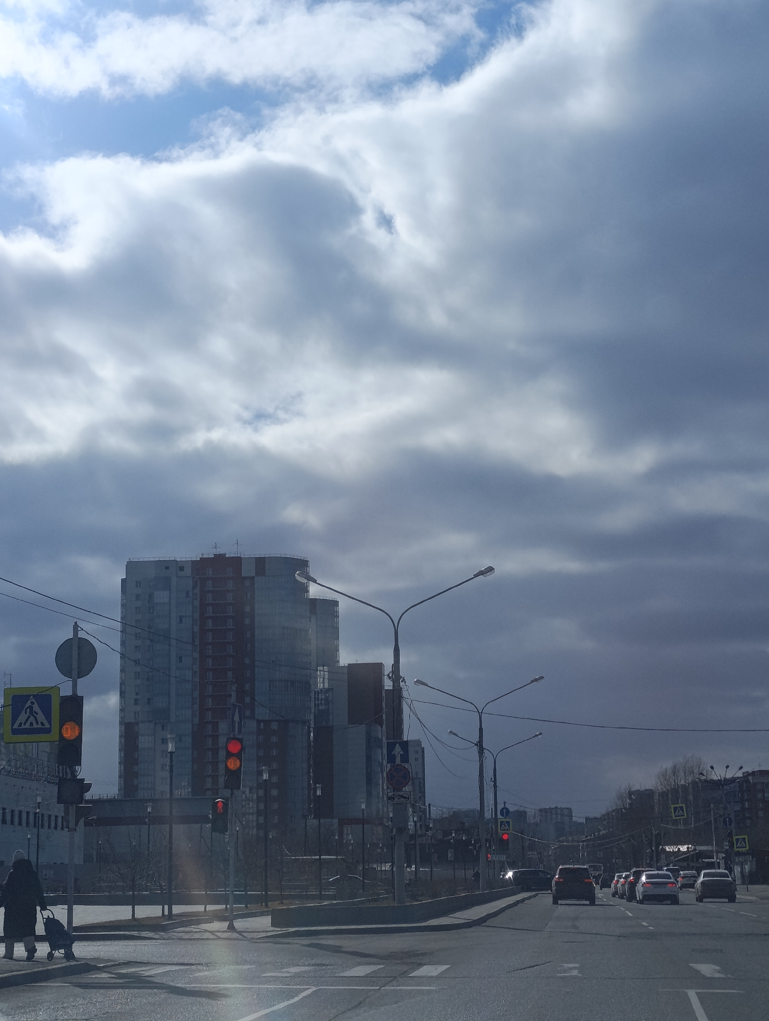 The image captures a gloomy yet somewhat bright urban street scene, likely in Krasnoyarsk, Russia, under an overcast sky with patches of blue and sunlight breaking through the clouds from the upper le…read more