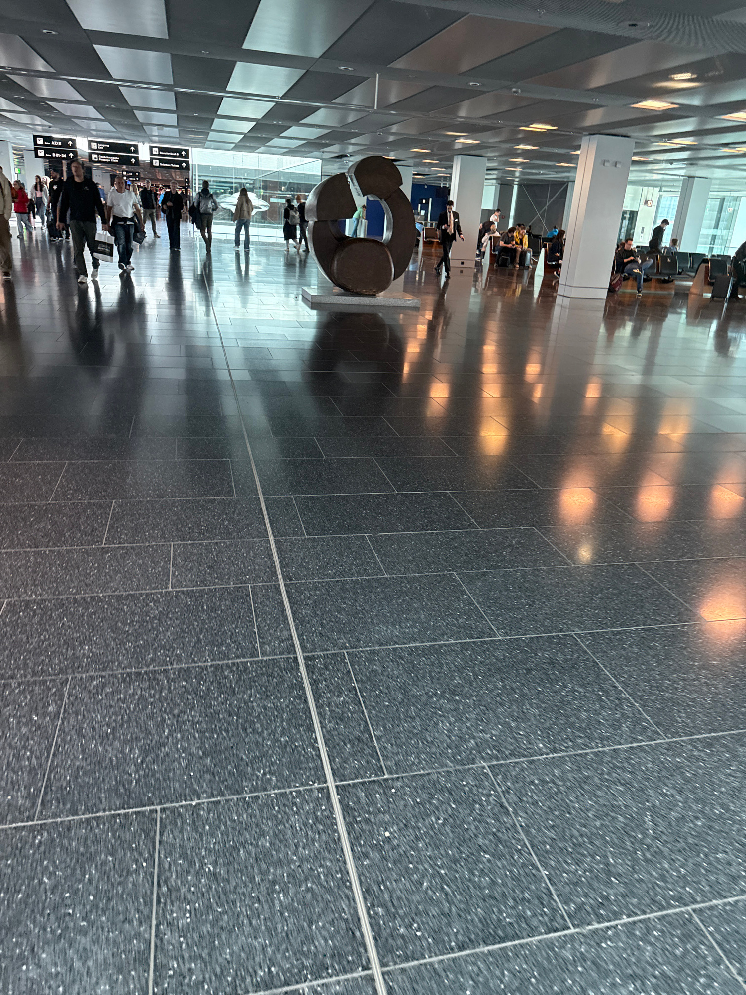 The image shows the interior of Zurich Airport (ZRH) in Kloten, Switzerland. A long corridor is visible with people walking towards various departure gates as indicated by overhead signs. The corridor…read more