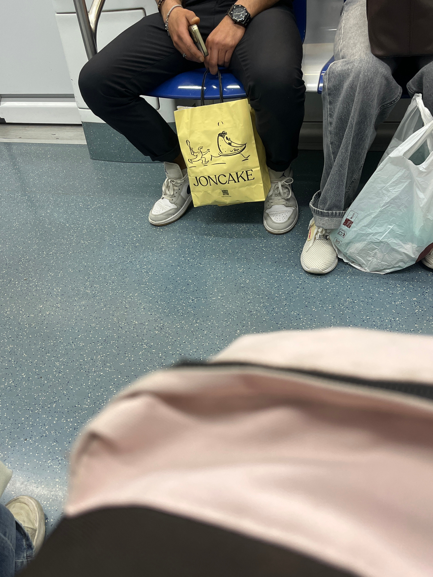The image shows a section of the interior of a vehicle, possibly a subway or train. There are three people visible. One is sitting in a blue seat, wearing black pants and white sneakers and holding a…read more
