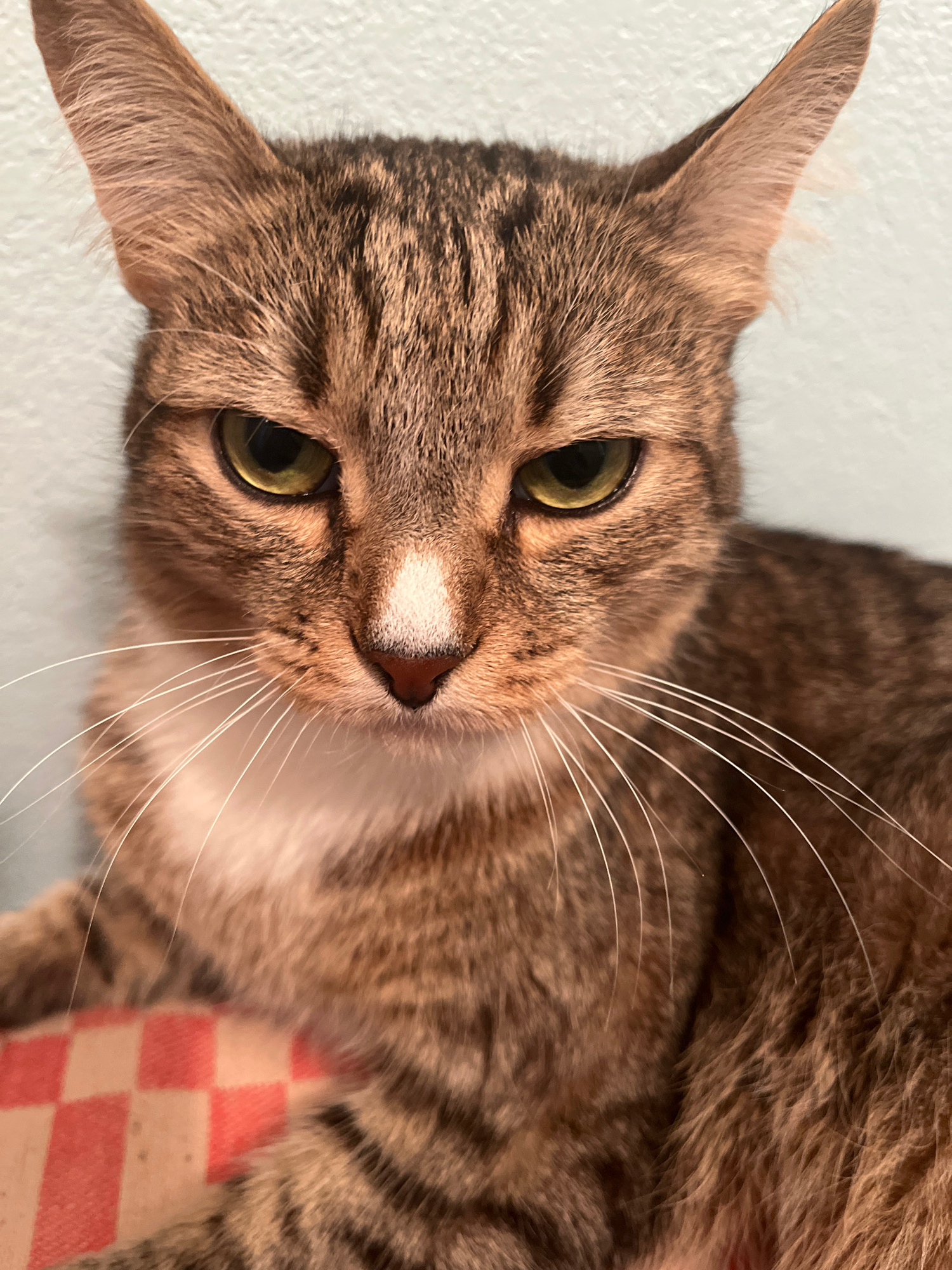 A close-up of a tabby cat's face with green eyes, a white patch on its nose, and long white whiskers. It is lying on a surface with a red and white checkered pattern, possibly a blanket. The backgroun…read more