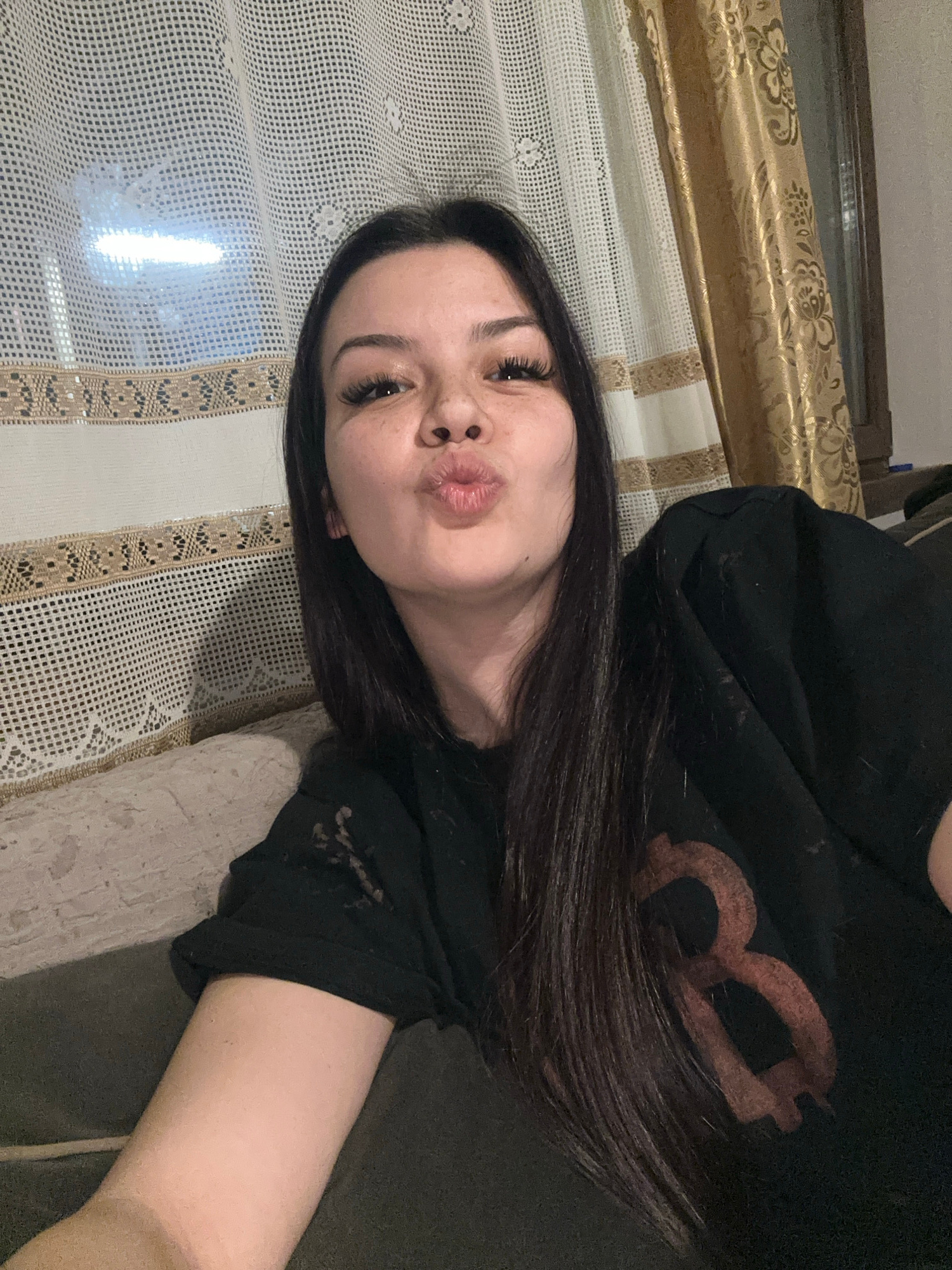 A young woman with long, dark hair is lying on a textured surface, likely a bedspread or tablecloth, with a window covered by a light-colored curtain in the background. She is wearing a dark-colored s…read more