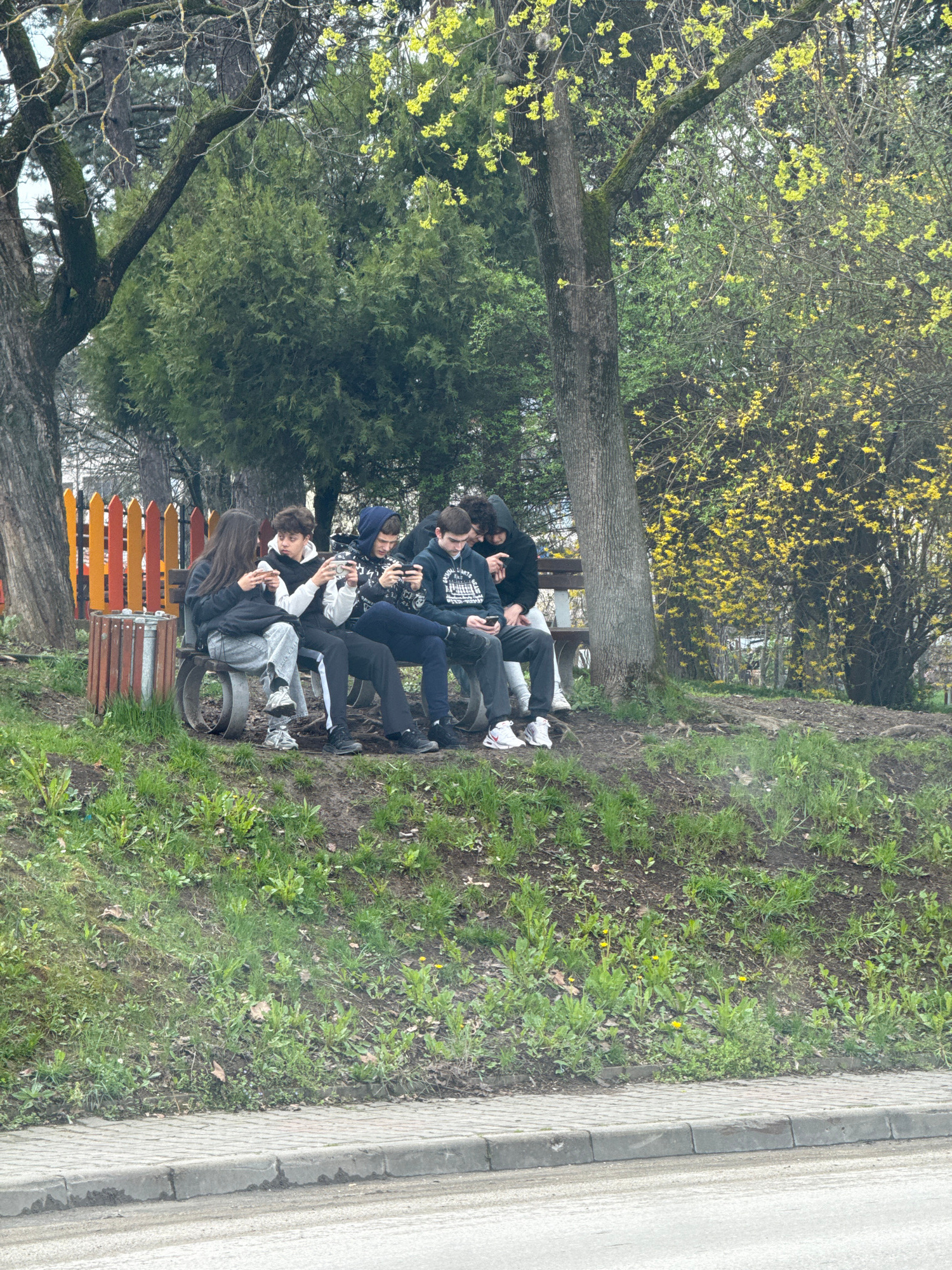A medium shot shows a group of approximately six young people sitting closely together on a park bench in Veliko Tarnovo, Bulgaria. The youths are of varying heights and builds, and they appear to be…read more