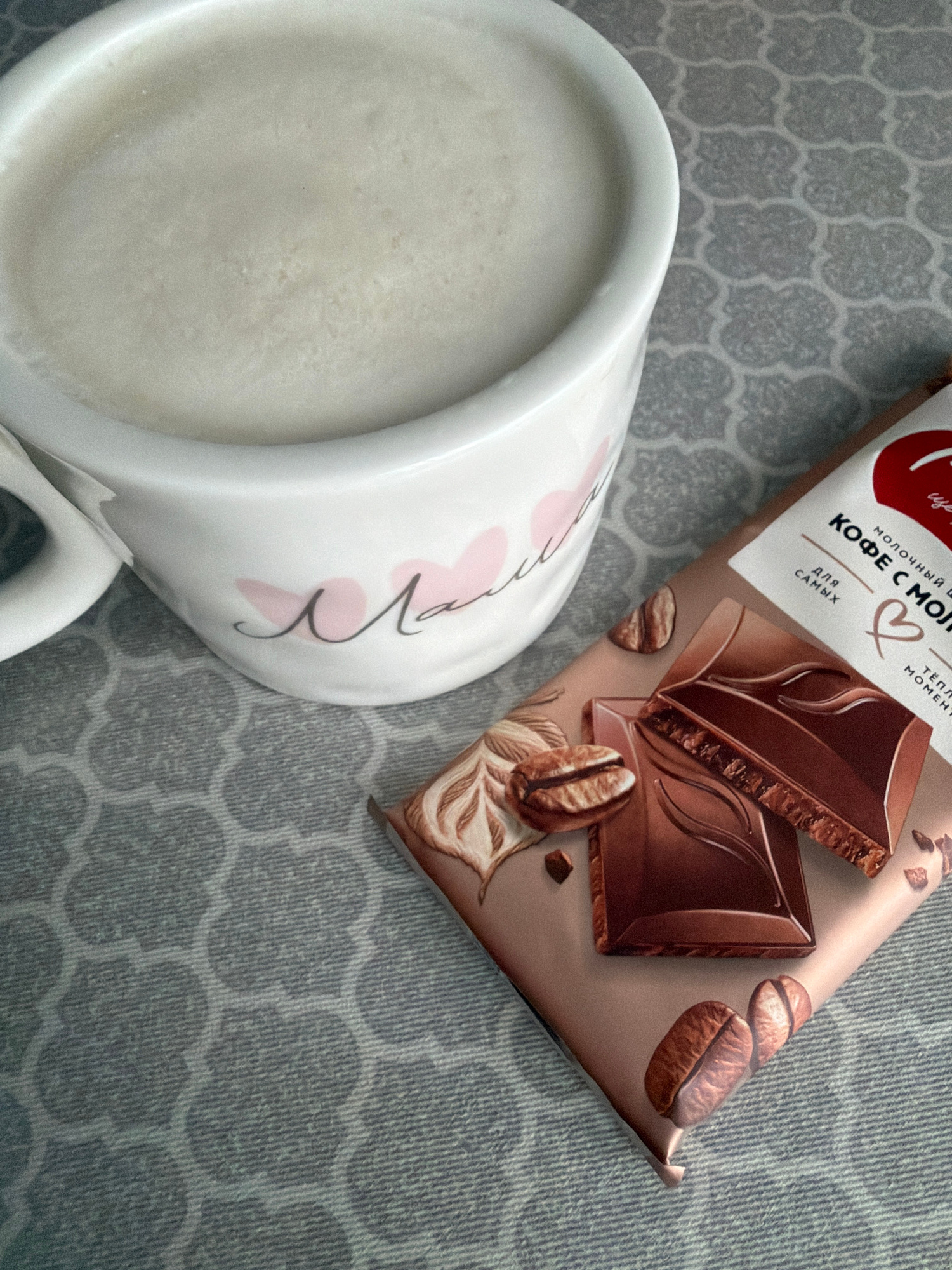 The image depicts a mug of a white liquid, likely milk or a milk-based beverage, and a chocolate bar with coffee flavor against a patterned surface. The chocolate bar is positioned diagonally in the u…read more