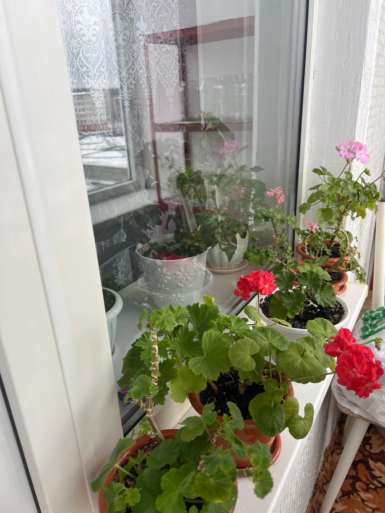 The image shows a windowsill in what is likely a residential building, based on the reflection in the window showing what appears to be curtains and another building. Several potted geranium plants ar…read more