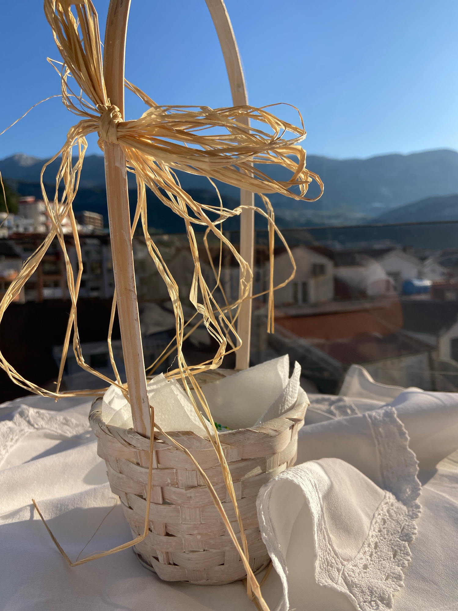 The image shows a small, woven basket with a handle adorned with raffia. The basket is filled with white paper napkins and is placed on a white tablecloth, possibly outdoors. In the background, a blur…read more